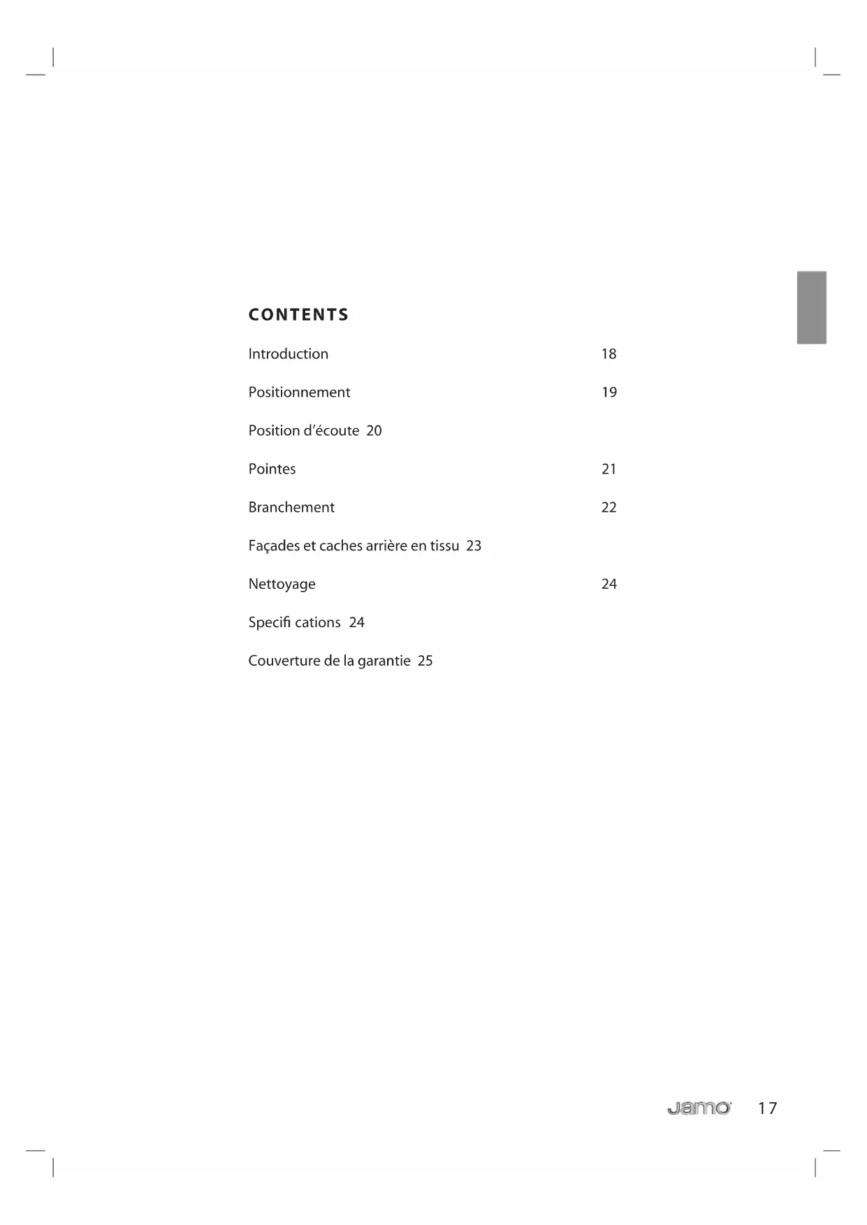 - Other defects due to conditions or circumstances beyond the supplier’s control Transportation costs for servicing are not covered by the warranty. The supplier is liable only to repair or replace defective parts or products and the supplier is not responsible for indirect losses or damages arising from the use of the product. A replacement cannot exceed the value of the product under warranty. To the extent that the enclosed conditions, including the limitation of liabilities, are inconsistent with indispensable regulations in the customer’s country of residence, the latter shall have precedence.14 www.jamo.com15 OWNERS MANUAL Jamo R 90716 français17 CONTENTS Introduction 18 Positionnement 19 Position d’écoute 20 Pointes 21 Branchement 22 Façades et caches arrière en tissu 23 Nettoyage 24 Specifi cations 24 Couverture de la garantie 2518 INTRODUCTION Bienvenue dans le cercle exclusif des possesseurs de Jamo R 907! Ce mode d’emploi vous fournit quelques conseils sur l’installation des enceintes dans votre pièce d’écoute. Pour une information plus détaillée sur les technologies utilisées, veuillez consulter le cahier technique des R 907. Notre premier conseil : une fois les enceintes R 907 positionnées dans votre pièce d’écoute, et avant de commencer le paramétrage acoustique, apprivoisez le son des enceintes en les écoutant sur 2 ou 3 jours. Cette manipulation comporte deux avan- tages. Premièrement, vous allez pouvoir ressentir la sonorité des enceintes. Deux- ièmement, vous allez roder les haut-parleurs. En effet, la qualité tonale de ce type de produit change légèrement après les deux premiers jours de fonctionnement. Les conseils de ce mode d’emploi sont seulement des recommandations. Il n’y a pas de règles strictes et précises pour installer une paire d’enceintes aussi unique soit-elle ! Lorsque vous en arrivez aux paramétrages de leur performance dans la pièce d’écoute, n’ayez pas peur d’expérimenter : une enceinte sonne différemment si vous la déplacez de seulement quelques centimètres. Déplacez vos enceintes dans la pièce afi n de trouver la meilleure position d’écoute et le meilleur son ! Faites toujours confi ance à vos impressions et à votre jugement pour déterminer ce qui sonne bien ! C’est ce que nous faisons. Bonne écoute ! français19 POSITIONNEMENT Pour commencer, nous vous suggérons de placer les R 907 à 90 cm (3ft) du mur situé derrière les enceintes et à 1m20 (4ft) des murs latéraux. Tournez chaque enceinte pour former un angle à 10 degrés par rapport au mur situé derrière l’enceinte afi n de réfl échir le son sur les murs avant et latéraux pour avoir l’impression acoustique d’une pièce beaucoup plus grande. Enceinte dipolaire, R 907 émet des ondes sonores vers l’avant et vers l’arrière de sa façade. Elle n’émet aucun son sur les côtés. Vous pouvez utiliser cette carac- téristique pour annuler les réfl exions des murs latéraux en changeant l’angle de l’enceinte par rapport au mur. 3 ft 4 ft 10˚20
