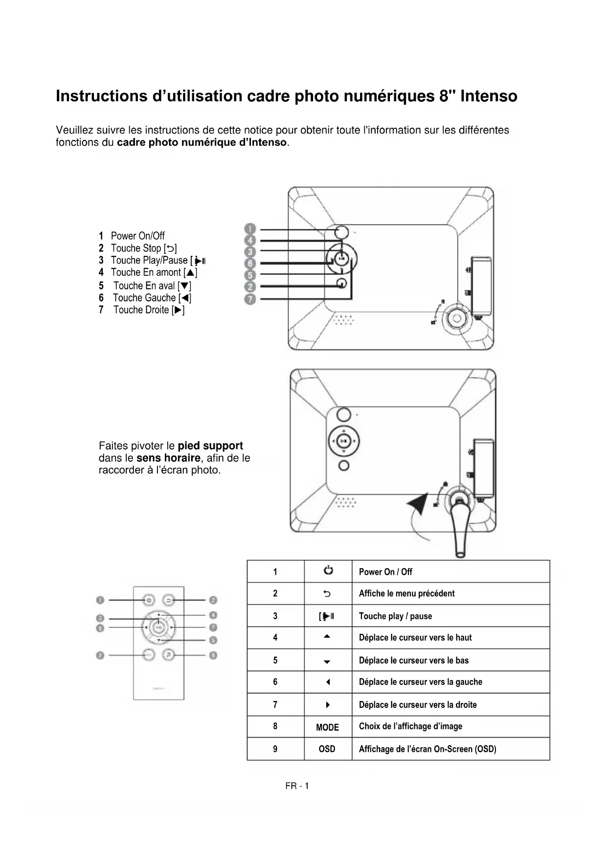 Nous espérons que l’Intenso cadre photo numérique vous fait plaisir!FR - 6 Soin et Entretien Soin Pour éviter des décharges électriques n’enlevez ni les vis ni le boîtier. N’utilisez pas cet appareil à proximité de l’eau. N’exposez pas l’appareil à la pluie ou à l’humidité. Ne posez pas des objets contenant de l’eau ou d’autres liquides à côté de l’appareil. N’installez pas ce cadre photo numérique à proximité de chauffages, de poêles ou d’autres appareils émettant de la chaleur. N’ouvrez pas le boîtier. N’essayez pas de réparer l’appareil. Il doit être réparé par des spécialistes. N’utilisez pas l’appareil à des endroits sablonneux. Mettez le connecteur adapteur du bloc d’alimentation complètement dans l’orifice du CPN. Ainsi, vous évitez des chargements électrostatiques. Connecter tous les raccordements correctement et sûrement. N’appuyez pas sur l’écran. Protégez l’écran d’une pénétration du soleil trop forte. Le cadre photo numérique ne peut lire que des formats compatibles. Des images peuvent être soumises au copyright. L’affichage sans licence peut désobéir aux droits copyright. Ne touchez pas le CPN avec des objets métalliques pendant le fonctionnement. Evitez l’utilisation sur des coussins, des canapés d’autres objets qui soutiennent une thermogénie, car l’appareil risque d’être surchauffé. N’enlevez pas de cartes de mémoire pendant la lecture. Sinon, il peut y avoir des bocages de système ou des pertes de données. Ne mettez pas l’appareil hors marche pendant un diaporama. N’emballez pas l’appareil directement après une utilisation de longue durée. Assurez un refroidissment suffissant. Sinon, l’appareil risque d’être surchauffé. Pour garantir un meilleur service, il peut y avoir des changements dans le mode d’emploi.
