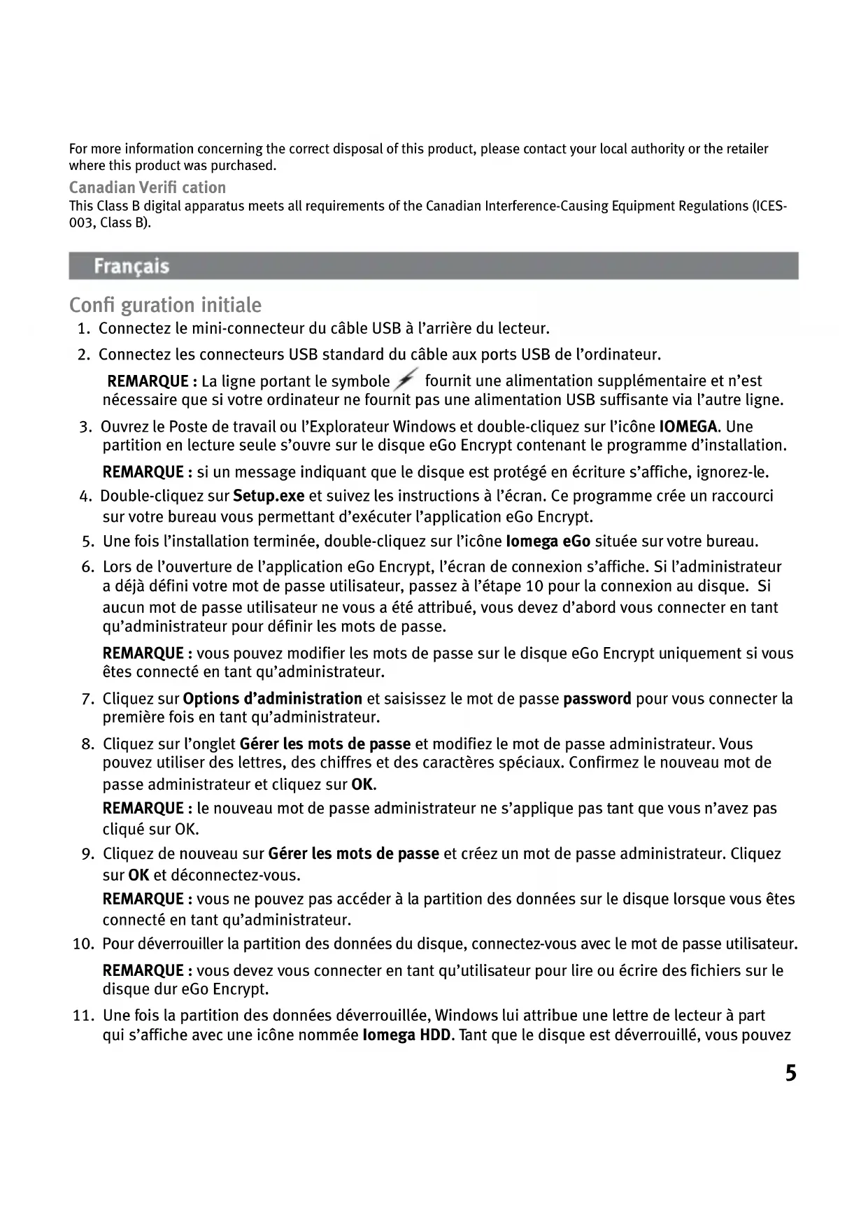 - Essayez de brancher les câbles sur d’autres ports USB de l’ordinateur. Si l’icône IOMEGA s’affiche, mais pas l’icône Iomega HDD de la partition des données, double-cliquez sur l’icône Iomega eGo située sur le bureau et entrez le mot de passe utilisateur pour déverrouiller le disque. La partition Iomega HDD est visible uniquement lorsque vous êtes connecté en tant qu’utilisateur. Si le problème persiste, visitez la section d’assistance sur le site www.iomega.com pour une aide supplémentaire au dépannage. Utilisation du disque Accès utilisateur Lorsque vous êtes connecté en tant qu’utilisateur, vous pouvez accéder à la partition des données Iomega HDD du disque eGo Encrypt. Cela vous permet d’afficher, de modifier et de créer des fichiers sur cette partition des données. La connexion utilisateur ne vous permet pas de modifier les mots de passe ou de procéder à l’effacement sécurisé du disque. Pensez à toujours vous déconnecter lorsque vous n’utilisez pas le disque pour garantir la sécurité de vos données. Si vous voulez déconnecter le périphérique USB, déconnectez-vous et suivez la procédure de retrait sécurisé de votre système d’exploitation. ATTENTION ! Pour éviter toute perte de données, ne déconnectez pas le lecteur pendant un transfert de données (voyant d’activité clignotant). Accès administrateur L’administrateur du disque peut définir ou modifier les mots de passe administrateur et utilisateur. Il peut également procéder à l’effacement sécurisé pour supprimer toutes les données du disque. La connexion administrateur ne permet pas l’accès à la partition des données du disque. Effacement sécurisé L’effacement sécurisé est une procédure irréversible supprimant toutes les données stockées sur la partition Iomega HDD. Pour effectuer l’effacement sécurisé, vous devez vous connecter en tant qu’administrateur. Une fois l’effacement terminé, vous devez formater la partition des données avec un système de fichiers NTFS. Pour le formatage de la partition des données, vous devez vous déconnecter et vous connecter en tant qu’utilisateur. Consultez le guide de l’utilisateur HTML pour obtenir des instructions détaillées.7 Guide complet de l’utilisateur Un guide de l’utilisateur complet est disponible au format HTML dans la section Support du site www.iomega.com. Garantie Limitée Iomega garantit que ce produit est exempt de tout vice de fabrication ou de malfaçon pendant toute la période de garantie. Cette garantie limitée n’est pas transférable et ne s’applique qu’à l’utilisateur final. La garantie est effective à partir de la date d’achat et reste ensuite valable pendant une période de un (1) an à compter de cette même date sur le continent américain ou dans la région Asie-Pacifique, quatre-vingt dix (90) jours pour les produits remis en état achetés dans les régions précédemment citées ou deux (2) ans dans le cadre d’un achat effectué par un utilisateur final en Europe, au Moyen-Orient ou en Afrique. Les clients enregistrant leurs nouveaux produits sur www.iomegareg.com dans les 90 jours suivant l’achat bénéficieront d’une extension de garantie. La durée totale de la garantie sera alors de trois (3) ans, dans toutes les régions. REMARQUE : les produits remis en état ne peuvent pas bénéficier d’une extension de garantie. Cette garantie ne s’applique pas : (a) aux produits logiciels Iomega, (b) aux composants consommables comme les fusibles ou les ampoules ou (c) aux produits tiers, matériel ou logiciel, fournis avec le produit sous garantie. Iomega ne garantit en aucun cas ces produits qui, si inclus, sont fournis “EN L’ETAT”. Sont exclus les dommages causés par un accident, une mauvaise utilisation, un usage abusif, l’utilisation de supports non fournis ou non approuvés par Iomega, une exposition excessive des supports à un champ magnétique ou tout autre cause externe d’origine naturelle. Votre seul et unique recours en cas de défaut reconnu est la réparation ou le remplacement du produit défectueux, aux frais et à la discrétion de Iomega (l’expédition pourra vous être facturée). Iomega se réserve le droit d’utiliser des pièces ou produits neufs ou remis en état pour procéder à la réparation. L’élément/produit remplacé sera garanti pendant le reste de la garantie d’origine ou, au maximum, trois (3) mois à dater de l’expédition desdits éléments/produits. S’il s’avère que Iomega est dans l’impossibilité de réparer ou remplacer un produit défectueux, votre seul recours sera le remboursement du prix d’achat initial. L’obligation de garantie de Iomega envers vous se limite aux éléments cités précédemment. EN AUCUN CAS IOMEGA NE POURRA ETRE TENUE POUR RESPONSABLE DES DOMMAGES OU PERTES INDIRECTS, ACCESSOIRES OU SPECIAUX, Y COMPRIS LA PERTE DE DONNEES, DE L’IMPOSSIBILITE D’UTILISATION OU DE PROFIT ET CE MEME SI IOMEGA A ETE AVERTIE DE L’EVENTUALITE DE TELS DOMMAGES. En aucun cas la responsabilité de Iomega ne pourra s’étendre au-delà du prix d’achat initial de l’appareil ou du support. Certaines juridictions ne reconnaissent pas l’exclusion ou la limitation des dommages accessoires ou indirects. De ce fait, les limitations ou les exclusions énoncées ci-dessus peuvent ne pas être applicables dans votre cas. Obtention d’un service de garantie Pour bénéficier des services sous garantie, vous devez en avertir Iomega pendant la période de garantie. A l’image des technologies et des conditions du marché, les procédures et les politiques d’Iomega en matière d’assistance clientèle (notamment la tarification des services) sont susceptibles de varier dans le temps. Afin d’obtenir des informations pertinentes sur les politiques actuelles ou sur le service de garantie d’Iomega, veuillez visiter notre site Web www.iomega.com/supportpolicy.html ou 