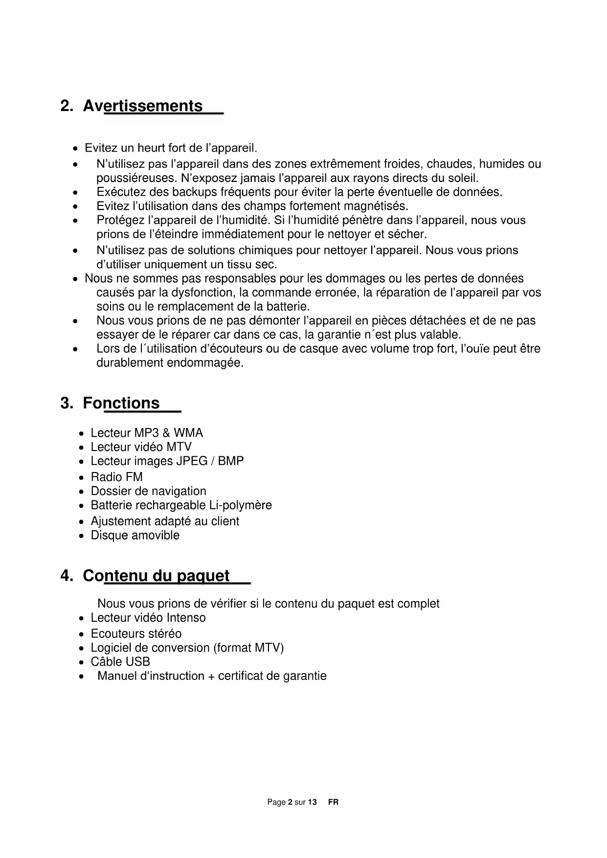 Nous vous prions de vérifier si le contenu du paquet est complet Lecteur vidéo Intenso Ecouteurs stéréo Logiciel de conversion (format MTV) Câble USB Manuel d‘instruction + certificat de garantiePage 3 sur 13 FR