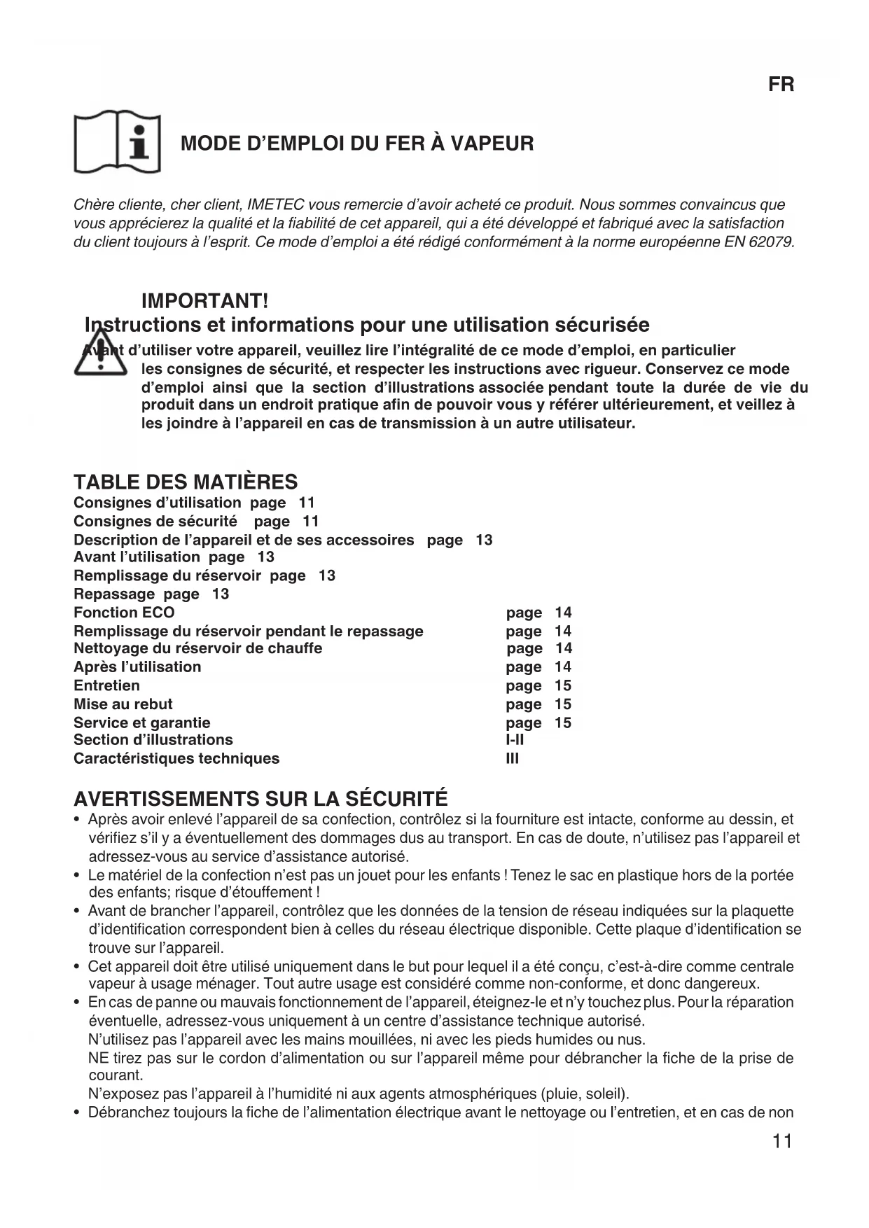 FR MODE D’EMPLOI DU FER À VAPEUR Chère cliente, cher client, IMETEC vous remercie d’avoir acheté ce produit. Nous sommes convaincus que
