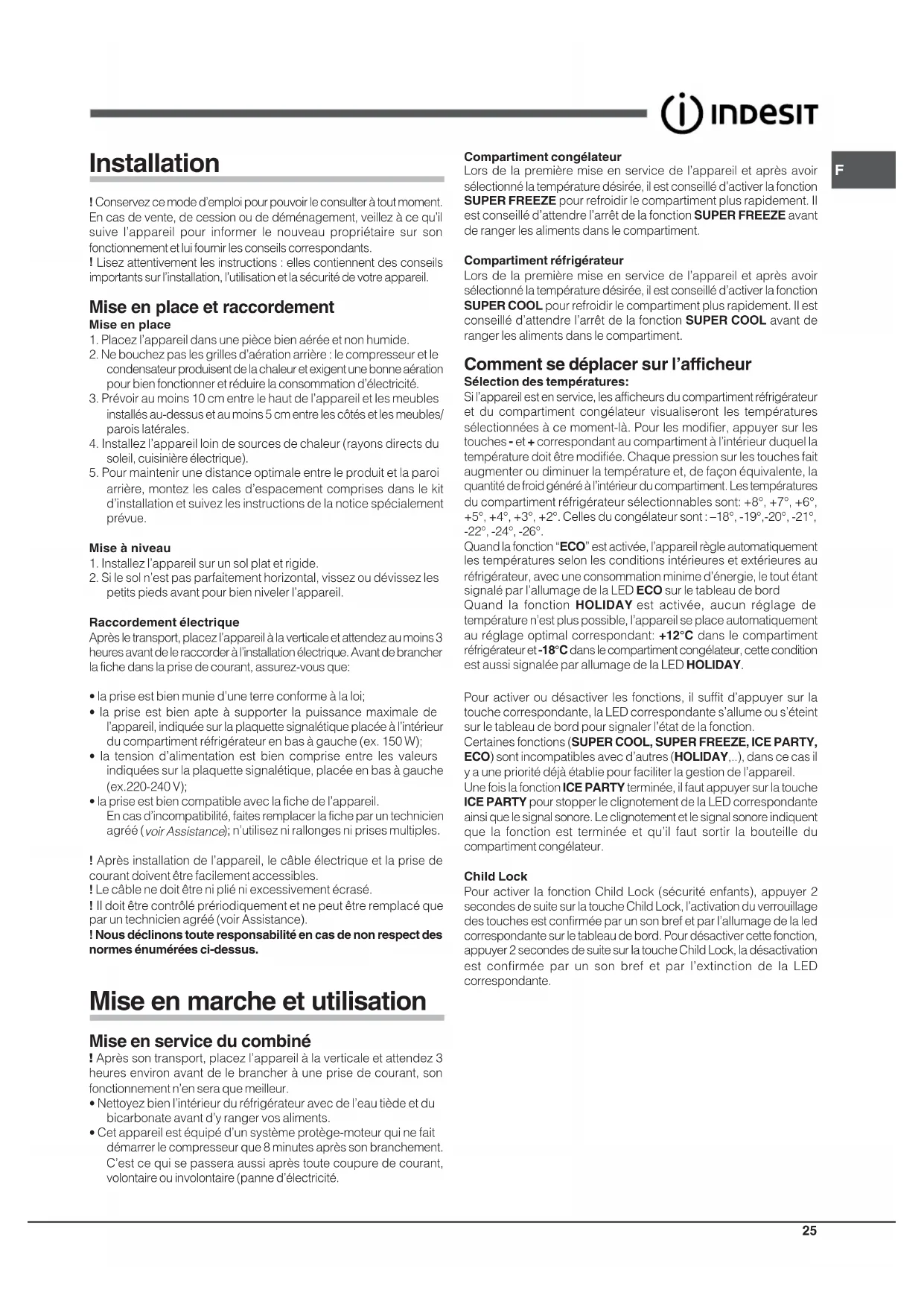 Lisez attentivement les instructions : elles contiennent des conseilsimportants sur l’installation, l’utilisation et la sécurité de votre appareil. Mise en place et raccordement Mise en place1. Placez l’appareil dans une pièce bien aérée et non humide.2. Ne bouchez pas les grilles d’aération arrière : le compresseur et lecondensateur produisent de la chaleur et exigent une bonne aérationpour bien fonctionner et réduire la consommation d’électricité.3. Prévoir au moins 10 cm entre le haut de l’appareil et les meublesinstallés au-dessus et au moins 5 cm entre les côtés et les meubles/parois latérales.4. Installez l’appareil loin de sources de chaleur (rayons directs dusoleil, cuisinière électrique).5. Pour maintenir une distance optimale entre le produit et la paroiarrière, montez les cales d’espacement comprises dans le kitd’installation et suivez les instructions de la notice spécialementprévue.Mise à niveau1. Installez l’appareil sur un sol plat et rigide.2. Si le sol n’est pas parfaitement horizontal, vissez ou dévissez lespetits pieds avant pour bien niveler l’appareil.Raccordement électriqueAprès le transport, placez l’appareil à la verticale et attendez au moins 3heures avant de le raccorder à l’installation électrique. Avant de brancherla fiche dans la prise de courant, assurez-vous que:• la prise est bien munie d’une terre conforme à la loi;• la prise est bien apte à supporter la puissance maximale del’appareil, indiquée sur la plaquette signalétique placée à l’intérieurdu compartiment réfrigérateur en bas à gauche (ex. 150 W);• la tension d’alimentation est bien comprise entre les valeursindiquées sur la plaquette signalétique, placée en bas à gauche(ex.220-240 V);• la prise est bien compatible avec la fiche de l’appareil.En cas d’incompatibilité, faites remplacer la fiche par un technicienagréé ( voir Assistance ); n’utilisez ni rallonges ni prises multiples.! Après installation de l’appareil, le câble électrique et la prise decourant doivent être facilement accessibles.! Le câble ne doit être ni plié ni excessivement écrasé.! Il doit être contrôlé prériodiquement et ne peut être remplacé quepar un technicien agréé (voir Assistance).! Nous déclinons toute responsabilité en cas de non respect desnormes énumérées ci-dessus. Mise en marche et utilisation