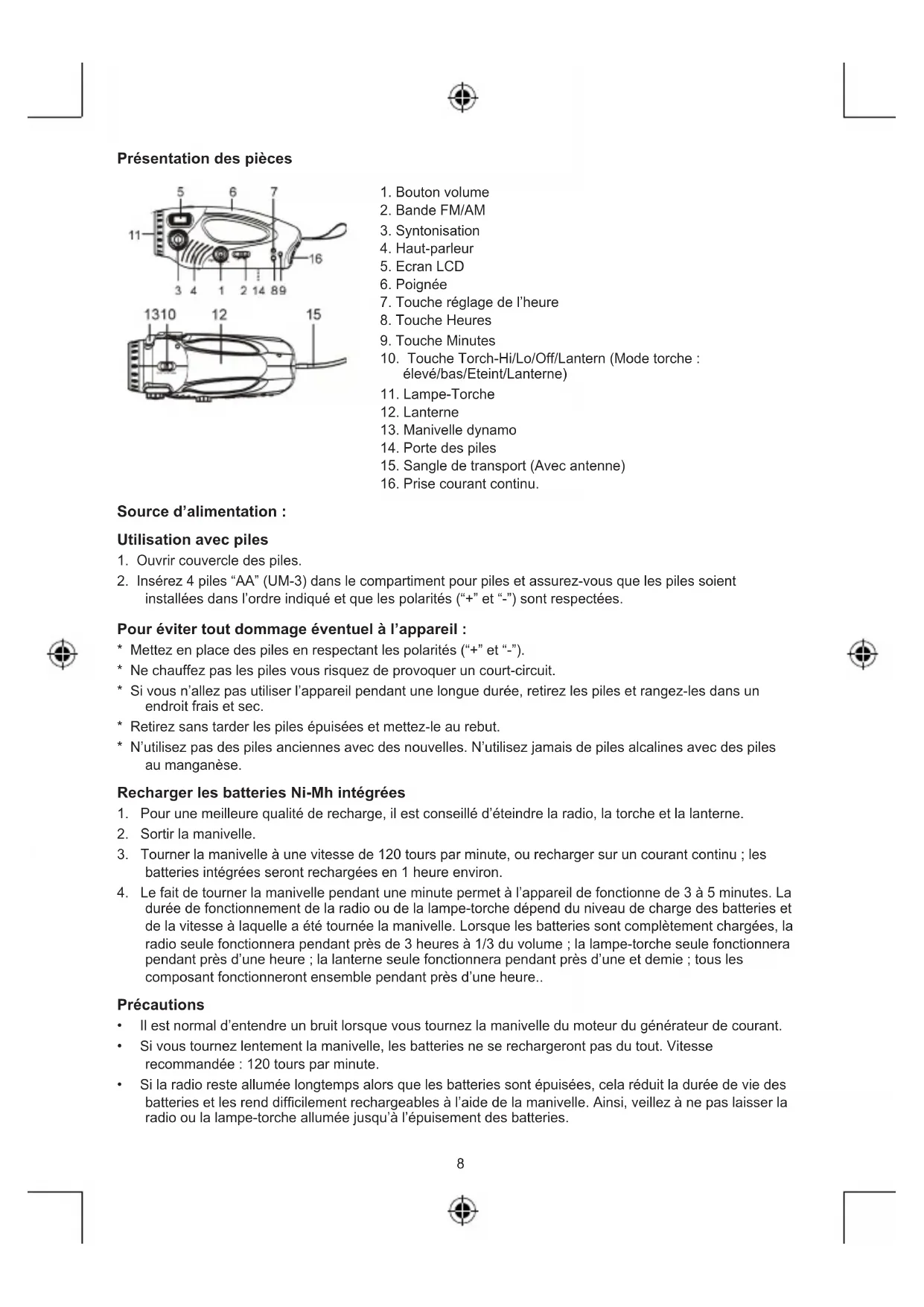 durée de fonctionnement de la radio ou de la lampe-torche dépend du niveau de charge des batteries et de la vitesse à laquelle a été tournée la manivelle. Lorsque les batteries sont complètement chargées, la radio seule fonctionnera pendant près de 3 heures à 1/3 du volume ; la lampe-torche seule fonctionnera pendant près d’une heure ; la lanterne seule fonctionnera pendant près d’une et demie ; tous les composant fonctionneront ensemble pendant près d’une heure.. Précautions