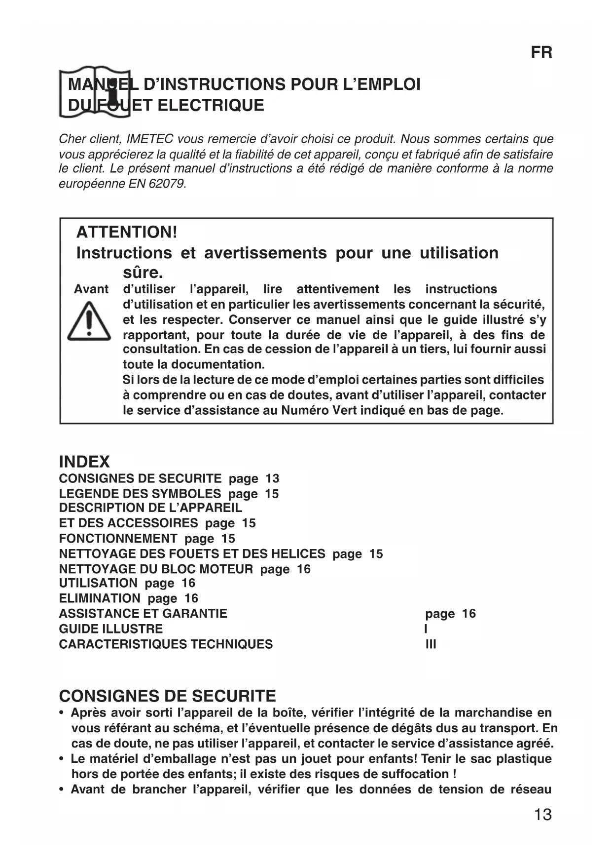 12FR MANUEL D’INSTRUCTIONS POUR L’EMPLOI DU FOUET ELECTRIQUE Cher client, IMETEC vous remercie d’avoir choisi ce produit. Nous sommes certains que