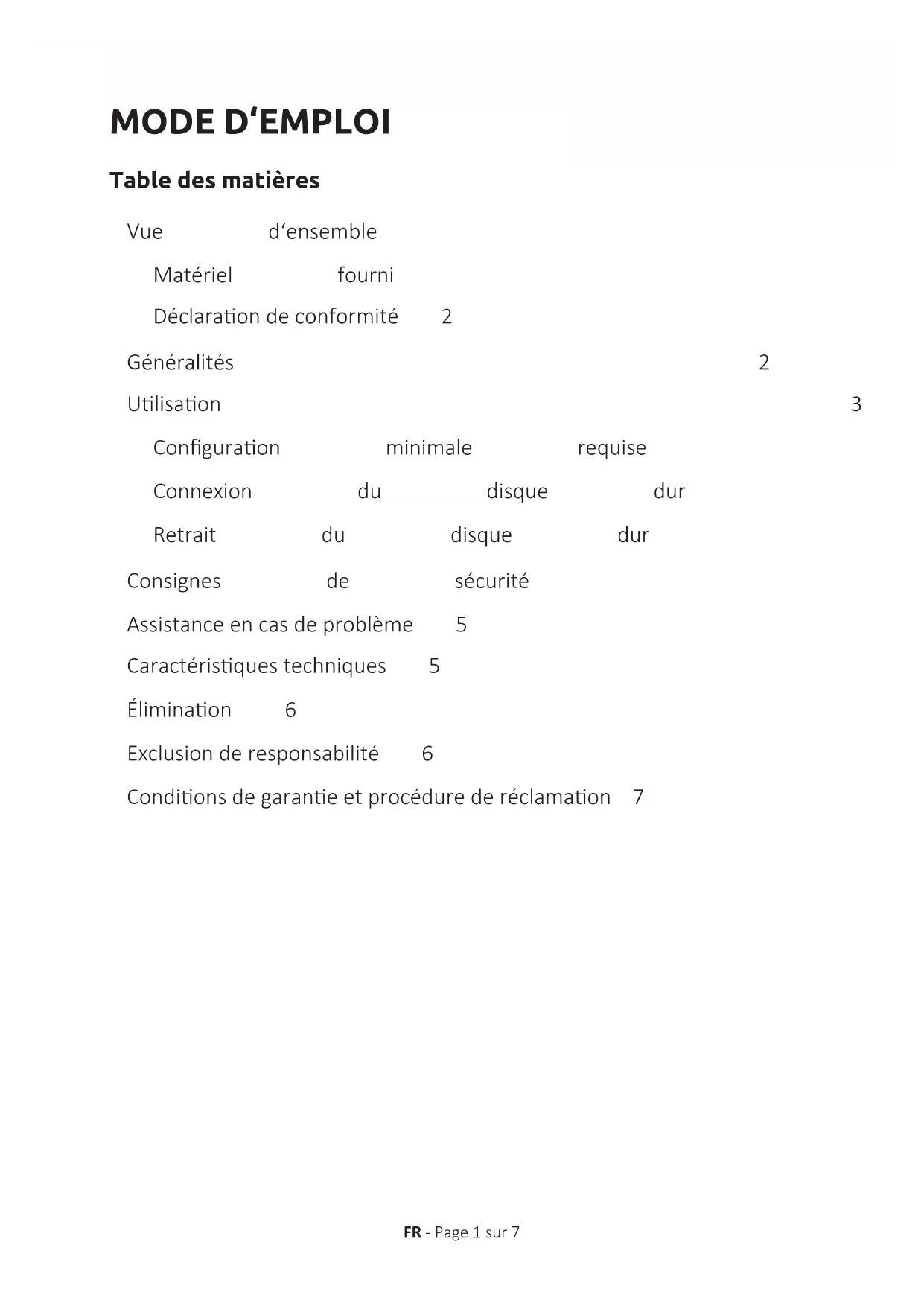 Service Center (your RMA-No.) Kopernikusstraße 12-14 D-49377 Vechta Contact: Email (technical support): support@intenso-internaonal.de Email (RMA-number): rma@intenso-internaonal.de Internet: www.intenso-internaonal.de Service Hotline: +49 (0) 900 –1 50 40 30 (0,39 € / min. from the German xed network mobile phone prices may vary.) Complaints procedure:MODE D‘EMPLOI FR - Page 1 sur 7 Table des matières Vue d‘ensemble 2 Matériel fourni 2 Déclaraon de conformité 2 Généralités 2 Ulisaon 3 Conguraon minimale requise 3 Connexion du disque dur 3 Retrait du disque dur 3 Consignes de sécurité 4 Assistance en cas de problème 5 Caractérisques techniques 5 Éliminaon 6 Exclusion de responsabilité 6 Condions de garane et procédure de réclamaon 7FR - Page 2 sur 7 Veuillez lire a en vement le présent mode d‘emploi et observer et respecter l‘ensemble des consignes gurant dans le présent mode d‘emploi a n de garan r une longue durée de vie et une u lisa on able de l‘appareil. Conservez le présent mode d‘emploi à portée de main et transme ez-le aux autres u lisateurs de l‘appareil le cas échéant. À propos de ce mode d‘emploi