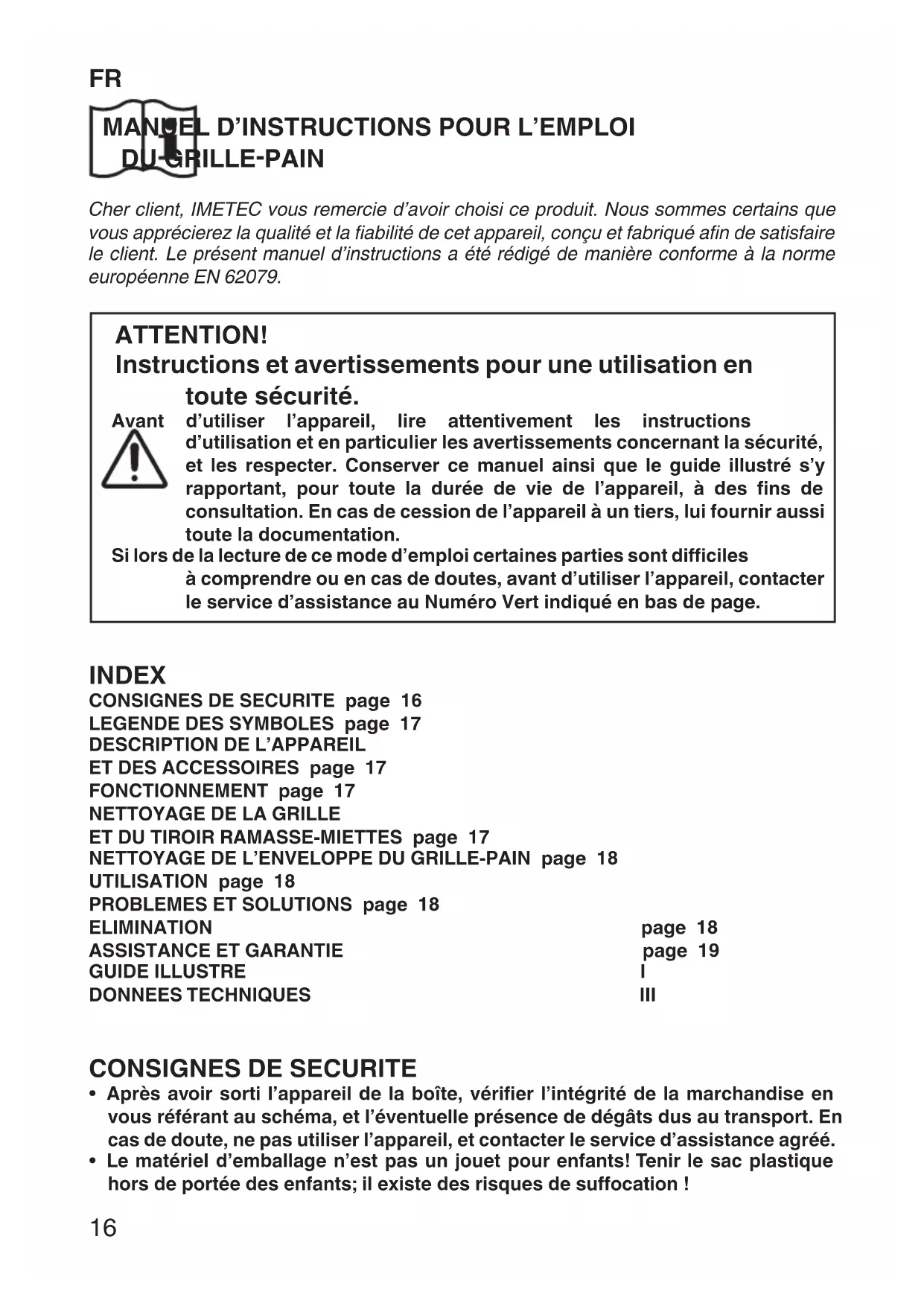 DUGRILLE-PAIN Cher client, IMETEC vous remercie d’avoir choisi ce produit. Nous sommes certains que
