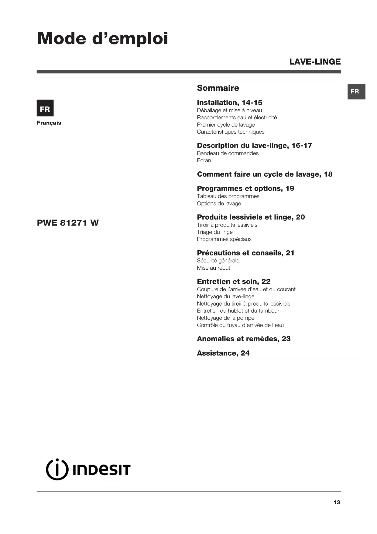 Retrouvez gratuitement la notice de l'appareil PWE 81271 W (EU) INDESIT au format PDF.