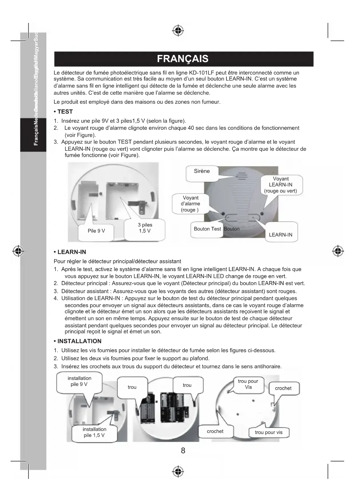 FRANÇAIS Le détecteur de fumée photoélectrique sans l en ligne KD-101LF peut être interconnecté comme un système. Sa communication est très facile au moyen d’un seul bouton LEARN-IN. C’est un système d’alarme sans l en ligne intelligent qui détecte de la fumée et déclenche une seule alarme avec les autres unités. C’est de cette manière que l’alarme se déclenche. Le produit est employé dans des maisons ou des zones non fumeur.
