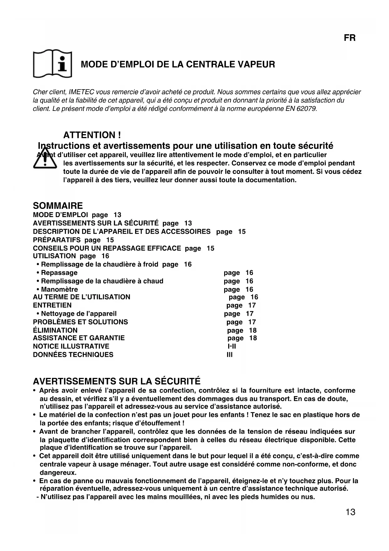 FR MODE D’EMPLOI DE LA CENTRALE VAPEUR Cher client, IMETEC vous remercie d’avoir acheté ce produit. Nous sommes certains que vous allez apprécier
