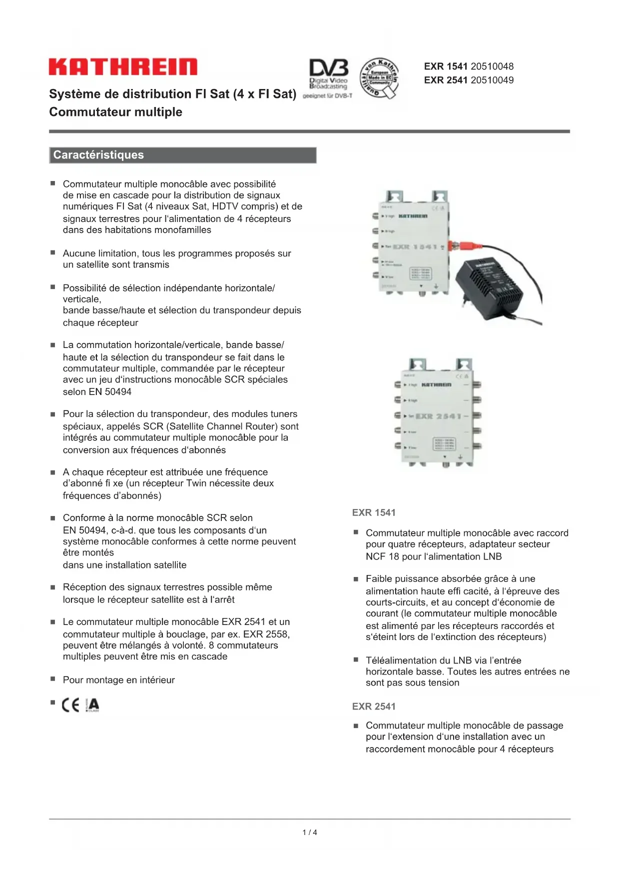 EXR 1541 20510048 EXR 2541 20510049 Système de distribution FI Sat (4 x FI Sat) Commutateur multiple Caractéristiques EXR 1541