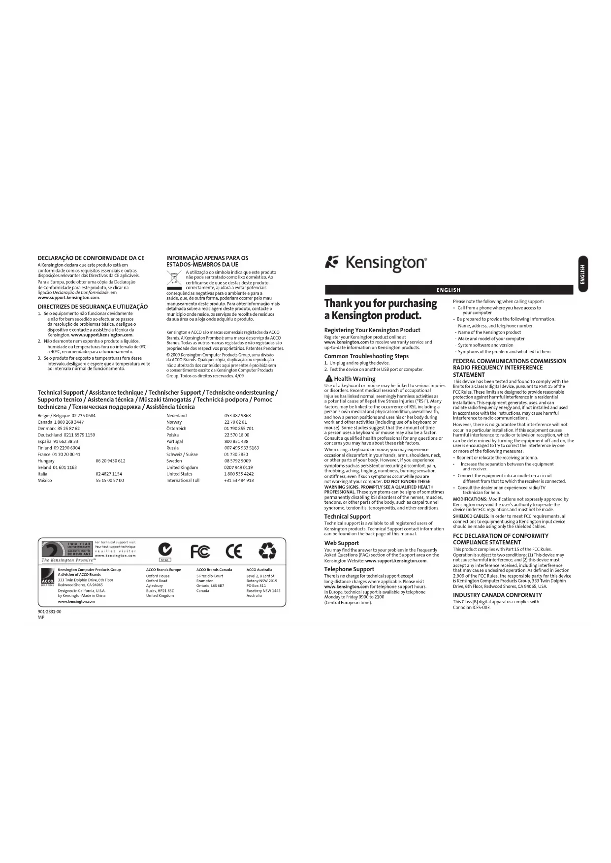 DANS LES PAYS MEMBRES DE L’UNION EUROPEENNE L’utilisation de ce symbole indique que ce produit ne peut pas être traité comme un déchet ménager ordinaire. En vous débarrassant de ce produit dans le respect de la réglementation en vigueur, vous contribuez à éviter les effets négatifs potentiels sur l’environnement et sur la santé humaine. Pour plus de détails sur le recyclage de ce produit, veuillez consulter le service municipal compétent, le service de ramassage des ordures ou le revendeur du produit. Kensington et ACCO sont des marques déposées d’ACCO Brands. The Kensington Promise est une marque de service d’ACCO Brands. Toutes les autres marques sont la propriété de leurs détenteurs respectifs. Brevets en cours. © 2009 Kensington Computer Products Group, une division d’ACCO Brands. Toute copie, duplication ou autre reproduction non autorisée du contenu de ce manuel est interdite sans le consentement écrit de Kensington Computer Products Group. Tous droits réservés. 4/09 Vielen Dank, dass Sie ein Produkt von Kensington erworben haben. Registrieren Ihres Kensington-Produkts Bitte melden Sie sich online unter www.kensington.com an, um den Garantieservice in Anspruch nehmen zu können und aktuelle Informationen zu Kensington-Produkten zu erhalten. Allgemeine Maßnahmen zur Fehlerbehebung