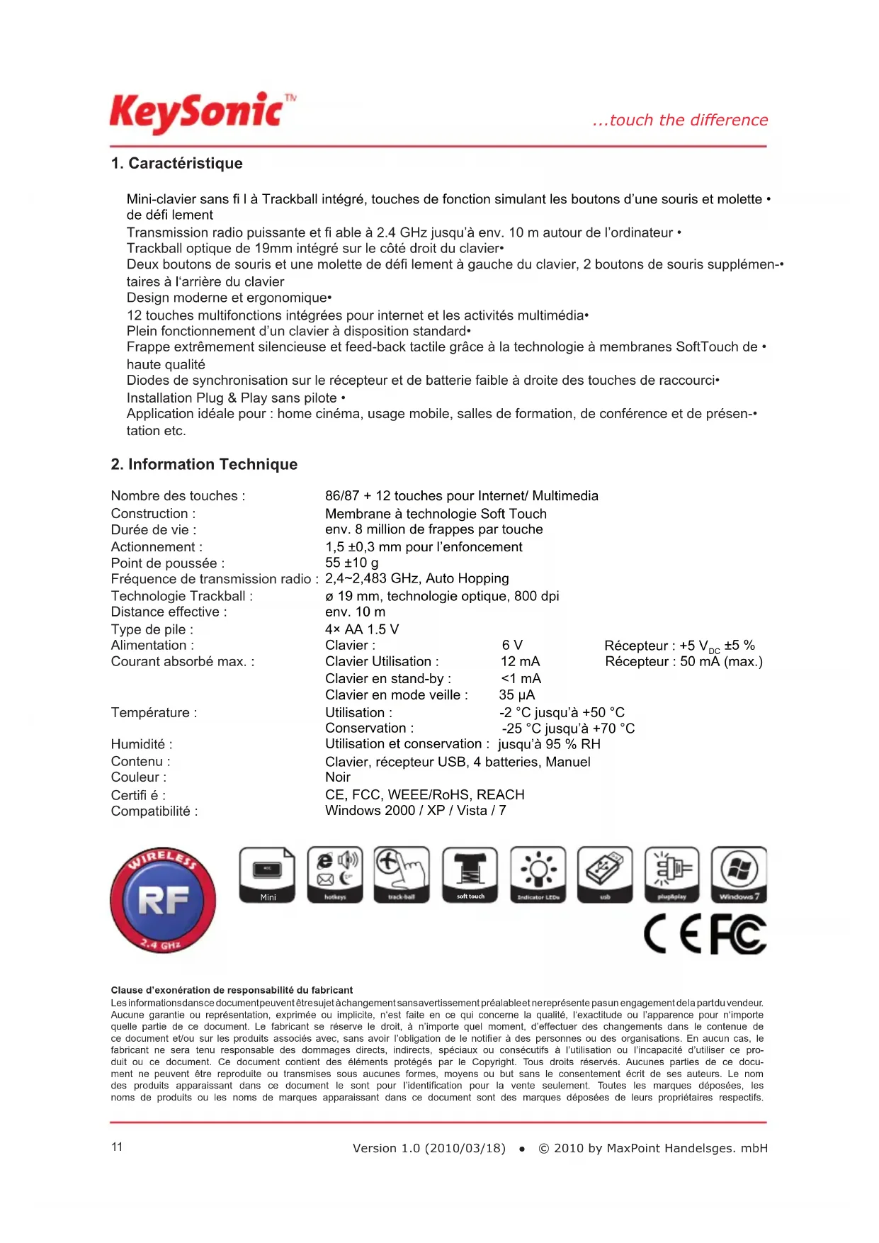 | Contenu: | Clavier, récepteur USB, 4 batteries, Manuel |