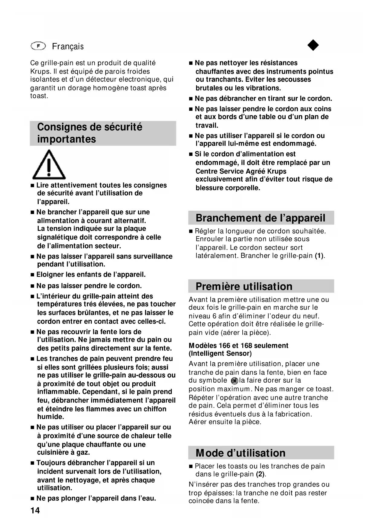 Ce grille-pain est un produit de qualité Krups. Il est équipé de parois froides isolantes et d’un détecteur electronique, qui garantit un dorage homogène toast après toast. Consignes de sécurité importantes ■ Lire attentivement toutes les consignes de sécurité avant l’utilisation de l’appareil. ■ Ne brancher l’appareil que sur une alimentation à courant alternatif. La tension indiquée sur la plaque signalétique doit correspondre à celle de l’alimentation secteur. ■ Ne pas laisser l’appareil sans surveillance pendant l’utilisation. ■ Eloigner les enfants de l’appareil. ■ Ne pas laisser pendre le cordon. ■ L’intérieur du grille-pain atteint des températures trés élevées, ne pas toucher les surfaces brûlantes, et ne pas laisser le cordon entrer en contact avec celles-ci. ■ Ne pas recouvrir la fente lors de l’utilisation. Ne jamais mettre du pain ou des petits pains directement sur la fente. ■ Les tranches de pain peuvent prendre feu si elles sont grillées plusieurs fois; aussi ne pas utiliser le grille-pain au-dessous ou à proximité de tout objet ou produit inflammable. Cependant, si le pain prend feu, débrancher immédiatement l’appareil et éteindre les flammes avec un chiffon humide. ■ Ne pas utiliser ou placer l’appareil sur ou à proximité d’une source de chaleur telle qu’une plaque chauffante ou une cuisinière à gaz. ■ Toujours débrancher l’appareil si un incident survenait lors de l’utilisation, avant le nettoyage, et après chaque utilisation. ■ Ne pas plonger l’appareil dans l’eau. ■ Ne pas nettoyer les résistances chauffantes avec des instruments pointus ou tranchants. Eviter les secousses brutales ou les vibrations. ■ Ne pas débrancher en tirant sur le cordon. ■ Ne pas laisser pendre le cordon aux coins et aux bords d’une table ou d’un plan de travail. ■ Ne pas utiliser l’appareil si le cordon ou l’appareil lui-même est endommagé. ■ Si le cordon d’alimentation est endommagé, il doit être remplacé par un Centre Service Agréé Krups exclusivement afin d’éviter tout risque de blessure corporelle. Branchement de l’appareil ■ Régler la longueur de cordon souhaitée. Enrouler la partie non utilisée sous l’appareil. Le cordon secteur sort latéralement. Brancher le grille-pain (1). Première utilisation Avant la première utilisation mettre une ou deux fois le grille-pain en marche sur le niveau 6 afin d’éliminer l’odeur du neuf. Cette opération doit être réalisée le grille- pain vide (aérer la pièce). Modèles 166 et 168 seulement (Intelligent Sensor) Avant la première utilisation, placer une tranche de pain dans la fente, bien en face du symbole et la faire dorer sur la position maximum. Ne pas manger ce toast. Répéter l’opération avec une autre tranche de pain. Cela permet d’éliminer tous les résidus éventuels dus à la fabrication. Aérer ensuite la pièce. Mode d’utilisation ■ Placer les toasts ou les tranches de pain dans le grille-pain (2). N’insérer pas des tranches trop grandes ou trop épaisses: la tranche ne doit pas rester coincée dans la fente. Français ◆15 ■ Sélectionner le niveau de dorage (3). Choisir entre 6-7 degrés de dorage différents en sélectionnant la position souhaitée : Position 1 = légèrement grillé Position 6/7 = très grillé L’intensité du dorage augmente en même temps que les chiffres du sélecteur. Pour le pain complet, régler le bouton de réglage sur un temps de dorage plus long que pour le pain blanc. Positionner le régulateur sur un chiffre inférieur si, par exemple, on souhaite griller seulement une tranche de pain. Important: Les morceaux de pain sec ou qui auraient été déjà grillés, brunissent plus rapidement et peuvent même, le cas échéant brûler. Il est donc recommandé de choisir un niveau de dorage inférieur pour ce type de pain et de ne pas laisser l’appareil fonctionner sans surveillance. Mise en marche ■ Après avoir branché l’appareil déplacer la commande de mise en marche jusqu’à ce qu’elle soit automatiquement bloquée (4). L’appareil fonctionne alors. Expulsion du pain ■ Le pain est expulsé automatiquement et l’appareil s’éteint une fois que le niveau de dorage préalablement sélectionné est atteint (5). ■ Retirer le pain. Attention: Si une tranche de pain reste bloquée dans l’appareil, débrancher immédiatement, laisser refroidir quelques minutes et dégager le pain délicatement, sans toucher les éléments chauffants. Bouton Stop ■ Pour interrompre le cycle de dorage, appuyer simplement sur le bouton Stop, le toast sera immédiatement éjecté (6). Extra-élévation L’extra-élévation permet de retirer plus facilement les toasts. ■ Lorsque le dorage est terminé, soulever la touche de descente et retirer les toasts (7). Fonctions possibles Chauffe-petits pains (Mod. 162, 164, 168) ■ Relever le chauffe-petits pains en pivotant vers le haut les deux supports (8). ■ Mod. 162, 164 Placer les petits pains sur les supports et sélectionner le degré de dorage. Mettre l’appareil en marche (9). ■ Mod. 168 Placer les petits pains sur les supports et mettre l’appareil en marche (9). Le temps de dorage est fixe et n’a donc pas à être sélectionné. Pour obtenir de meilleurs résultats, retourner les petits pains et répéter l’operation de dorage. Après utilisation, abaisser le chauffe-petits pains en pivotant vers le bas les deux supports. Le chauffe-petits pains ne doit pas être utilisé plus de 10 minutes. Chauffe-petits pains amovible (Mod. 160, 170) ■ Poser le chauffe-petits pains sur le grille- pain (10). Placer les petits pains sur les supports et sélectionner le degré de dorage. Mettre l’appareil en marche. Pour obtenir de meilleurs résultats, retourner les petits pains et répéter l’operation de dorage. Après utilisation, laisser refroidir le chauffe- petits pains avant de le retirer. Le ma