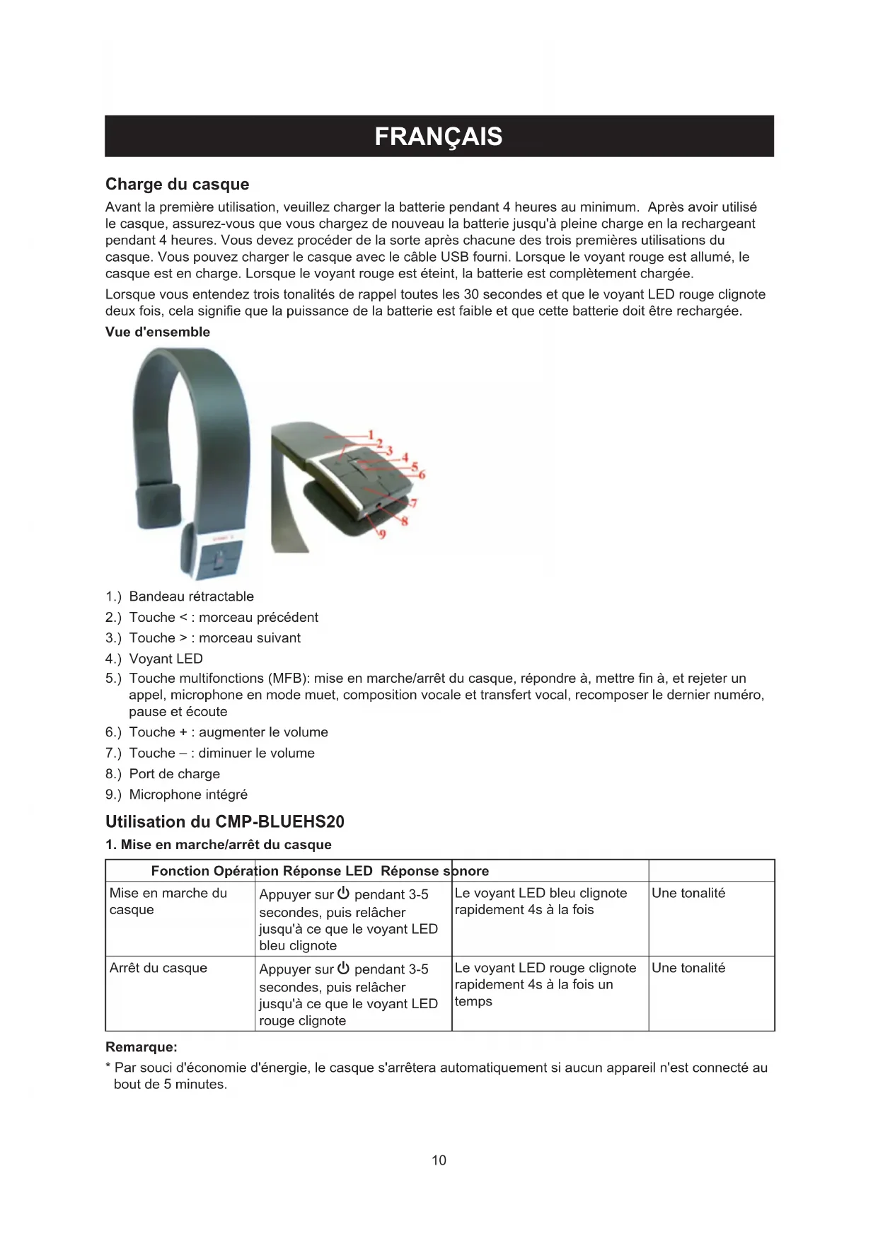 - Par souci d'économie d'énergie, le casque s'arrêtera automatiquement si aucun appareil n'est connecté au bout de 5 minutes.11