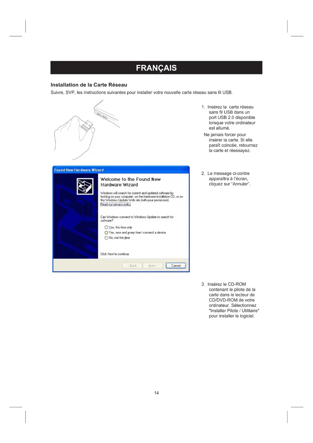 Suvire, SVP, les instructions suivantes pour installer votre nouvelle carte réseau sans fil USB.