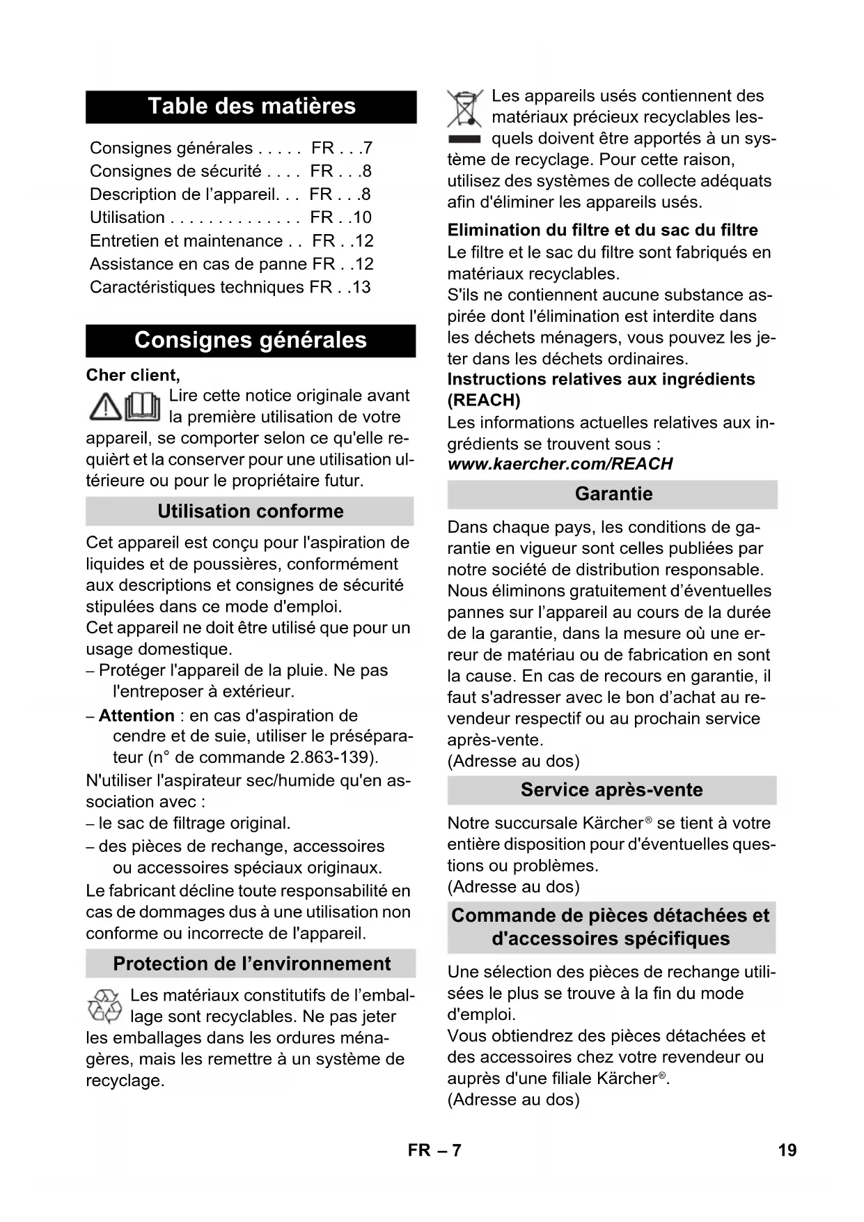 J 1 Technical specifications Voltage Output P nom Output P max Max. connection output of appli- ance socket Mains fuse (slow-blow) Container capacity Water intake with handle Water intake with floor nozzle Power cord Sound pressure level (EN 60704-2-1) Weight (without accessories) 18 EN– 7 Cher client, Lire cette notice originale avant la première utilisation de votre appareil, se comporter selon ce qu'elle re- quièrt et la conserver pour une utilisation ul- térieure ou pour le propriétaire futur. Cet appareil est conçu pour l'aspiration de liquides et de poussières, conformément aux descriptions et consignes de sécurité stipulées dans ce mode d'emploi. Cet appareil ne doit être utilisé que pour un usage domestique. – Protéger l'appareil de la pluie. Ne pas l'entreposer à extérieur. – Attention : en cas d'aspiration de cendre et de suie, utiliser le présépara- teur (n° de commande 2.863-139). N'utiliser l'aspirateur sec/humide qu'en as- sociation avec : – le sac de filtrage original. – des pièces de rechange, accessoires ou accessoires spéciaux originaux. Le fabricant décline toute responsabilité en cas de dommages dus à une utilisation non conforme ou incorrecte de l'appareil. Les matériaux constitutifs de l’embal- lage sont recyclables. Ne pas jeter les emballages dans les ordures ména- gères, mais les remettre à un système de recyclage. Les appareils usés contiennent des matériaux précieux recyclables les- quels doivent être apportés à un sys- tème de recyclage. Pour cette raison, utilisez des systèmes de collecte adéquats afin d'éliminer les appareils usés. Le filtre et le sac du filtre sont fabriqués en matériaux recyclables. S'ils ne contiennent aucune substance as- pirée dont l'élimination est interdite dans les déchets ménagers, vous pouvez les je- ter dans les déchets ordinaires. Instructions relatives aux ingrédients (REACH) Les informations actuelles relatives aux in- grédients se trouvent sous : www.kaercher.com/REACH Dans chaque pays, les conditions de ga- rantie en vigueur sont celles publiées par notre société de distribution responsable. Nous éliminons gratuitement d’éventuelles pannes sur l’appareil au cours de la durée de la garantie, dans la mesure où une er- reur de matériau ou de fabrication en sont la cause. En cas de recours en garantie, il faut s'adresser avec le bon d’achat au re- vendeur respectif ou au prochain service après-vente. (Adresse au dos) Notre succursale Kärcher