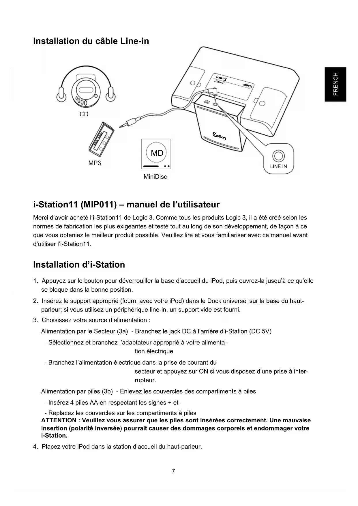MP3 Installation du câble Line-in LINE IN i-Station11 (MIP011) – manuel de l’utilisateur Merci d’avoir acheté l’i-Station11 de Logic 3. Comme tous les produits Logic 3, il a été créé selon les normes de fabrication les plus exigeantes et testé tout au long de son développement, de façon à ce que vous obteniez le meilleur produit possible. Veuillez lire et vous familiariser avec ce manuel avant d’utiliser l’i-Station11. Installation d’i-Station
