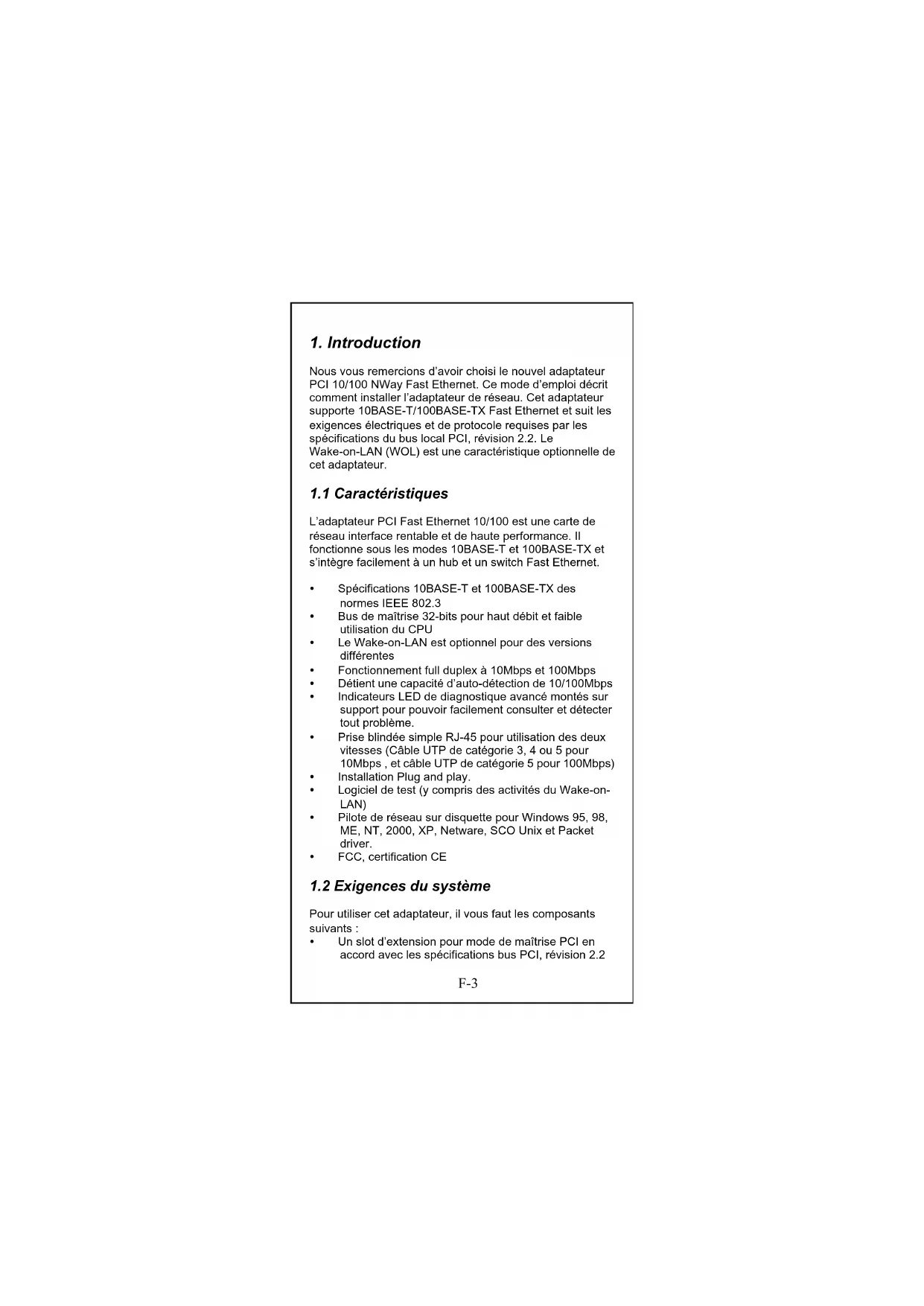 Pour utiliser cet adaptateur, il vous faut les composants suivants : F-3 y Un slot d’extension pour mode de maîtrise PCI en accord avec les spécifications bus PCI, révision 2.2y Un lecteur de disquette 3,5”, 1,44 MB y Les câbles suivants: Pour un fonctionnement à 10Mbps, un câble UTP de catégorie 3, 4 ou 5 Pour un fonctionnement à 100Mbps, un câble UTP de catégorie 5