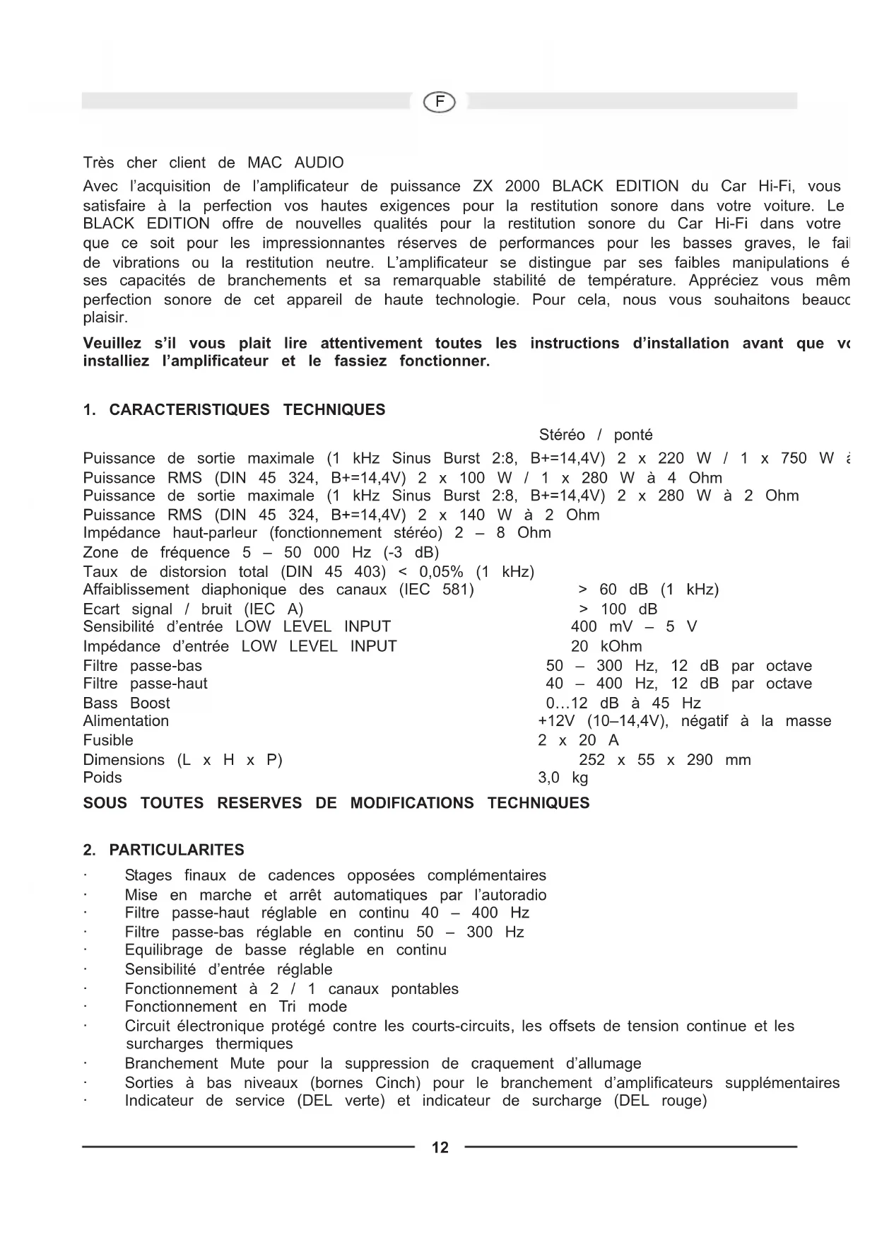Très cher client de MAC AUDIO Avec l’acquisition de l’amplificateur de puissance ZX 2000 BLACK EDITION du Car Hi-Fi, vous pouvez satisfaire à la perfection vos hautes exigences pour la restitution sonore dans votre voiture. Le ZX 2000 BLACK EDITION offre de nouvelles qualités pour la restitution sonore du Car Hi-Fi dans votre voiture; que ce soit pour les impressionnantes réserves de performances pour les basses graves, le faible facteur de vibrations ou la restitution neutre. L’amplificateur se distingue par ses faibles manipulations électriques, ses capacités de branchements et sa remarquable stabilité de température. Appréciez vous même la perfection sonore de cet appareil de haute technologie. Pour cela, nous vous souhaitons beaucoup de plaisir. Veuillez s’il vous plait lire attentivement toutes les instructions d’installation avant que vous installiez l’amplificateur et le fassiez fonctionner.