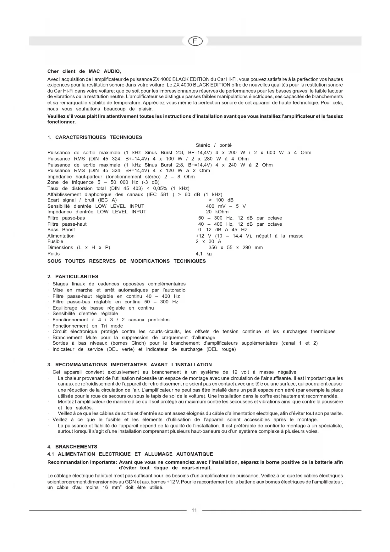 Cher client de MAC AUDIO, Avec l’acquisition de l’amplificateur de puissance ZX 4000 BLACK EDITION du Car Hi-Fi, vous pouvez satisfaire à la perfection vos hautes exigences pour la restitution sonore dans votre voiture. Le ZX 4000 BLACK EDITION offre de nouvelles qualités pour la restitution sonore du Car Hi-Fi dans votre voiture; que ce soit pour les impressionnantes réserves de performances pour les basses graves, le faible facteur de vibrations ou la restitution neutre. L’amplificateur se distingue par ses faibles manipulations électriques, ses capacités de branchements et sa remarquable stabilité de température. Appréciez vous même la perfection sonore de cet appareil de haute technologie. Pour cela, nous vous souhaitons beaucoup de plaisir. Veuillez s’il vous plait lire attentivement toutes les instructions d’installation avant que vous installiez l’amplificateur et le fassiez fonctionner.