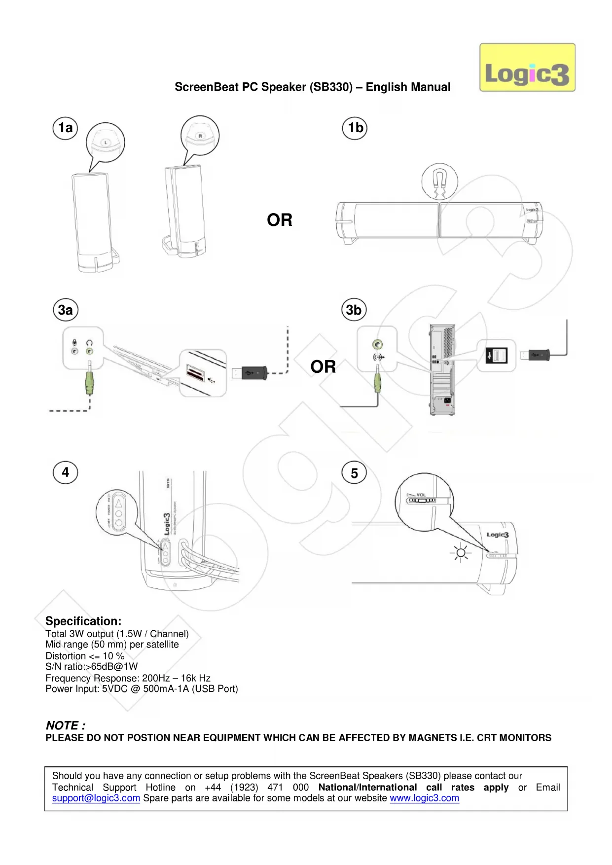 En cas de problèmes de connexion ou de réglage avec la ScreenBeat PC Speakers (SB330), veuillez contacter notre ligne téléphonique d’assistance technique au +44 (1923) 471 000. Les tarifs nationaux/internationaux s’appliquent ou bien veuillez envoyer un message à support@logic3.com. Les pièces de rechange pour certains modèles sont proposées sur notre site Web www.logic3.com. Logic3ScreenBeat PC Speaker (SB330) – Benutzerhandbuch Systemspezifikationen Gesamtleistung 3W (1.5W / Kanal) Mitteltöner (50 mm) pro Satellit Verzerrung <= 10 %Rauschabstand:>65dB@1WFrequenzbereich: 200Hz – 16k Hz Netzeingang: 5VDC bei 500mA-1A (USB Port) HINWEIS: BITTE NICHT NEBEN GERÄTEN PLAZIEREN, DIE DURCH MAGNETFELDER BEEINTRÄCHTIGT WERDEN