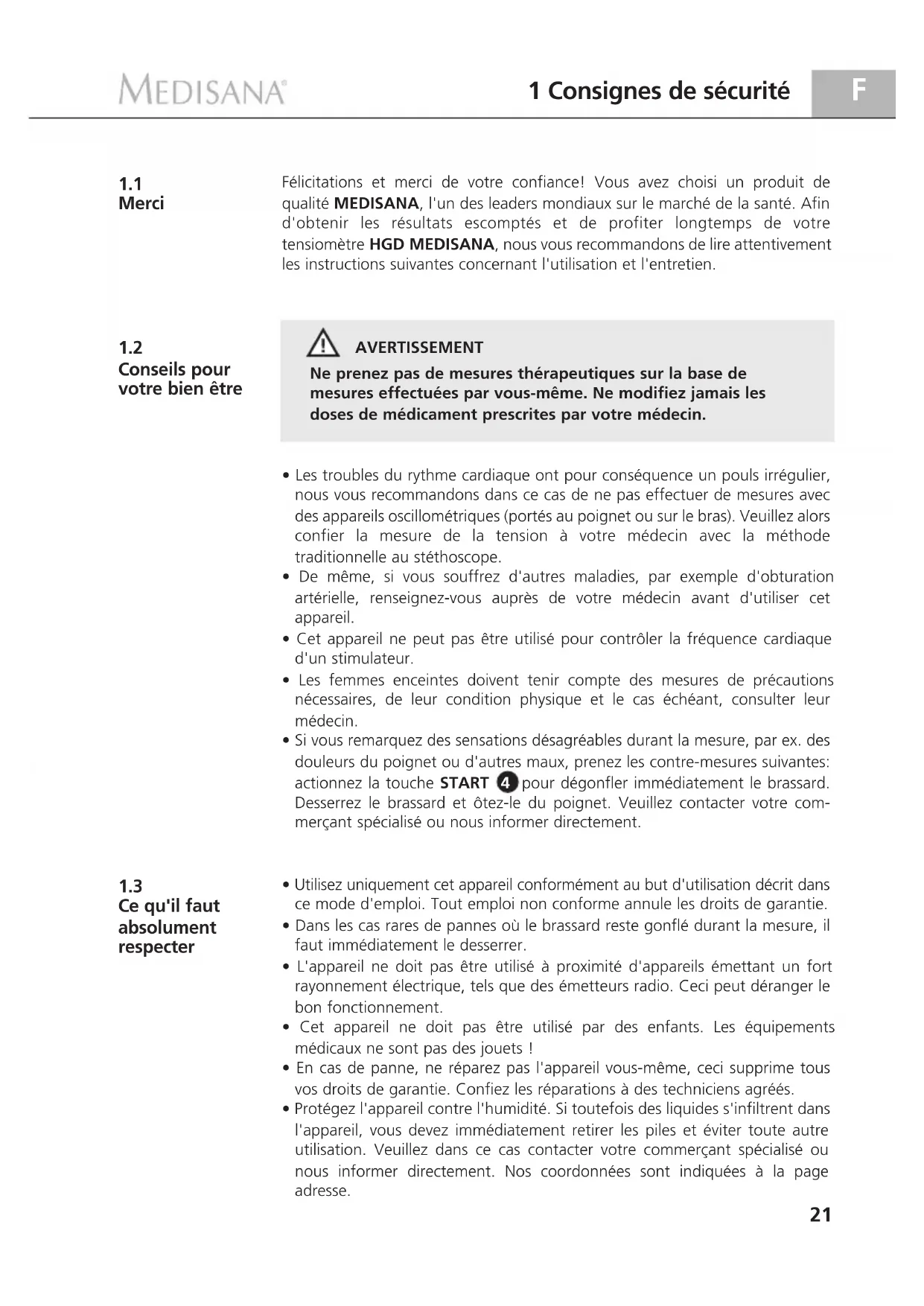 Conseils pour votre bien être Félicitations et merci de votre confiance! Vous avez choisi un produit de qualité MEDISANA, l'un des leaders mondiaux sur le marché de la santé. Afin d'obtenir les résultats escomptés et de profiter longtemps de votre tensiomètre HGD MEDISANA, nous vous recommandons de lire attentivement les instructions suivantes concernant l'utilisation et l'entretien. AVERTISSEMENT Ne prenez pas de mesures thérapeutiques sur la base de mesures effectuées par vous-même. Ne modifiez jamais les doses de médicament prescrites par votre médecin.