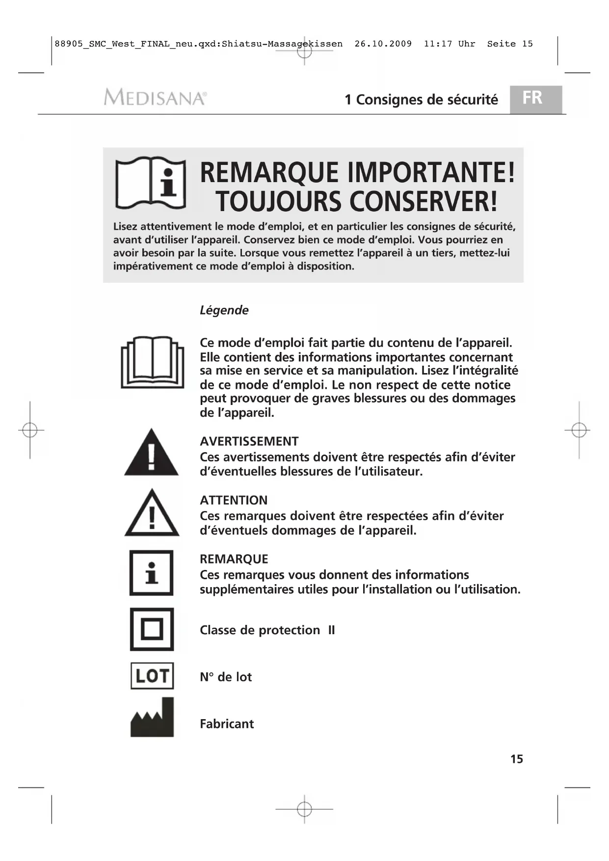 Rangez l’appareil dans son emballage d’origine et conservez-le dans un endroit propre et sec. Cet appareil ne doit pas être placé avec les ordures ménagères. Chaque consommateur doit ramener les appareils électriques ou électroniques, qu’ils contiennent des substances nocives ou non, à un point de collecte de sa commune ou dans le commerce afin de permettre leur élimination écologique. Pour plus de renseignements sur l’élimination des déchets, veuillez vous adresser aux services de votre commune ou bien à votre revendeur. Nom et modèle : Coussin de massage Shiatsu SMC MEDISANA Alimentation électrique : 230 V~ 50 Hz Puissance consommée : environ 25 W Arrêt automatique : au bout de 15 minutes env. Conditions de fonctionnement : uniquement dans des pièces sans humidité Conditions de rangement : sec et frais Dimensions : environ 36 x 24 x 10 cm Poids : environ 1,85 kg Longueur de câble : environ 1,9 m Numéro d’article : 88905 Numéro EAN : 40 15588 88905 9 Dans le cadre du travail continu d’amélioration des produits, nous nous réservons le droit de procéder à des modifications techniques et de design. 88905_SMC_West_FINAL_neu.qxd:Shiatsu-Massagekissen 26.10.2009 11:17 Uhr Seite 2021