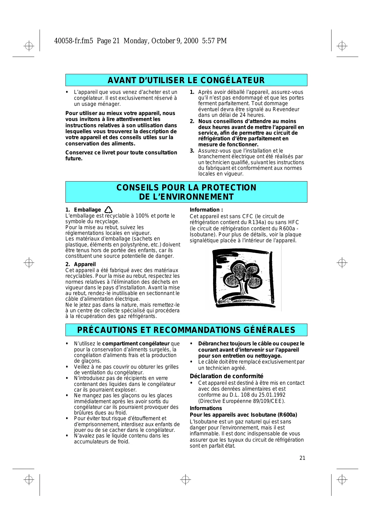 L’appareil que vous venez d’acheter est un congélateur. Il est exclusivement réservé à un usage ménager. Pour utiliser au mieux votre appareil, nous vous invitons à lire attentivement les instructions relatives à son utilisation dans lesquelles vous trouverez la description de votre appareil et des conseils utiles sur la conservation des aliments. Conservez ce livret pour toute consultation future.