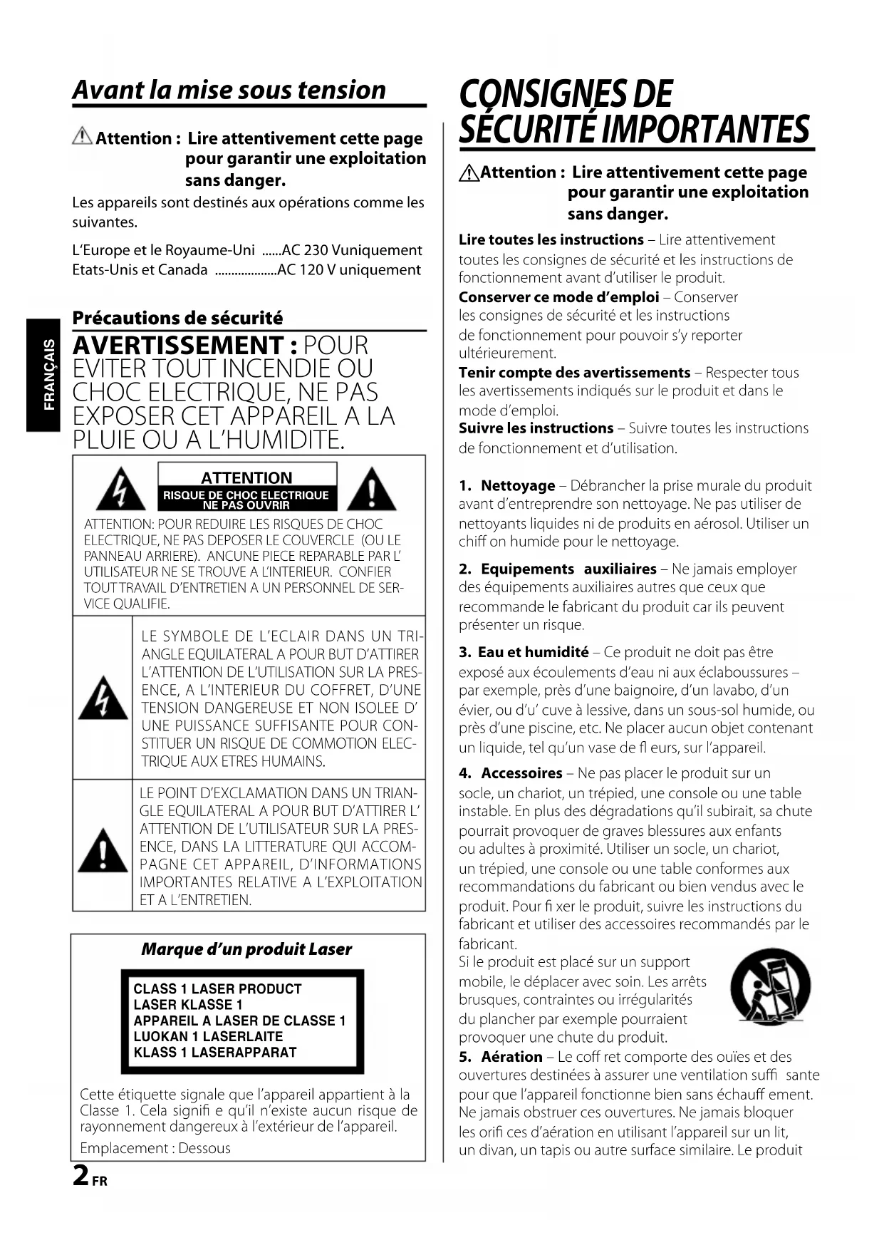 FR FRANÇAIS Avant la mise sous tension Attention : Lire attentivement cette page pour garantir une exploitation sans danger.Les appareils sont destinés aux opérations comme les suivantes.L‘Europe et le Royaume-Uni AC 230 VuniquementEtats-Unis et Canada AC 120 V uniquement Précautions de sécurité