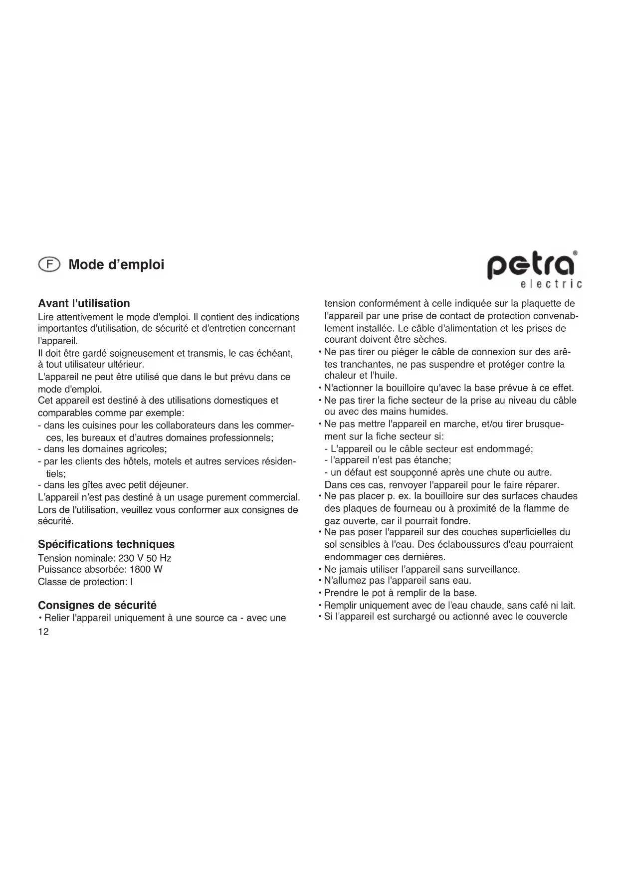 express is available at select retailers or from petra-electric in a 500 ml bottole.12 Avant l'utilisation Lire attentivement le mode d'emploi. Il contient des indications importantes d'utilisation, de sécurité et d'entretien concernant l'appareil. Il doit être gardé soigneusement et transmis, le cas échéant, à tout utilisateur ultérieur. L'appareil ne peut être utilisé que dans le but prévu dans ce mode d'emploi. Cet appareil est destiné à des utilisations domestiques et comparables comme par exemple: - dans les cuisines pour les collaborateurs dans les commer- ces, les bureaux et d’autres domaines professionnels; - dans les domaines agricoles; - par les clients des hôtels, motels et autres services résiden- tiels; - dans les gîtes avec petit déjeuner. L’appareil n’est pas destiné à un usage purement commercial. Lors de l'utilisation, veuillez vous conformer aux consignes de sécurité. Spécifications techniques Tension nominale: 230 V 50 Hz Puissance absorbée: 1800 W Classe de protection: I Consignes de sécurité