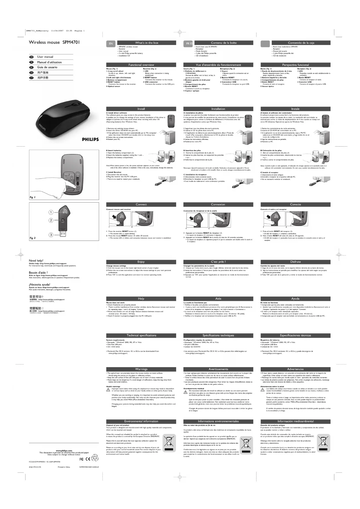 Vue d’ensemble du fonctionnement Souris (Fig. 1)1 Mollette de défilement à 4 directionsPermet de défiler vers le haut, le bas, lagauche et la droite.2 Boutons gauche et droit pourcliquer3 Compartiment des piles4 Bouton RESETConnecte la souris au récepteur.5 Capteur optiqueRécepteur (Fig. 2)1 VoyantClignote quand la connexion est encours.2 Bouton RESETConnecte le récepteur à la souris.3 Connecteur USBConnecte le récepteur au port USB. C'est prêt ! Changer les paramètres de la souris 1 Cliquez sur l’icône de la souris, dans l’angle inférieur droit de votre barre des tâches. 2 Suivez les instructions à l’écran pour ajuster les paramètres de la souris selon vospréférences personnelles.3 Appuyez sur ‘OK’ pour quitter l’application et retourner en mode de fonctionnementnormal. Aide La souris ne fonctionne pas• Vérifiez si les piles sont placées correctement. • Il peut y avoir une interférence provenant d’un autre périphérique sans fil. Reconnectez la souris et le récepteur en répétant les étapes 1 et 2 de la section « Connexion ».• La souris et le récepteur sont hors de portée l’un de l’autre.Réduisez la distance entre la souris et le récepteur (max. 10 mètres / 30 pieds).• Vérifiez si le récepteur est correctement branché au port USB du PC.Configuration requise du système• Microsoft ® Windows ® 2000, Me, XP ou Vista• Un port USB libre• Lecteur de CD/DVD• Les versions pour Macintosh Mac OS X 10.1.x-10.4.x peuvent être téléchargées surwww.philips.com/support. Connexion Connexion du récepteur et de la souris 12