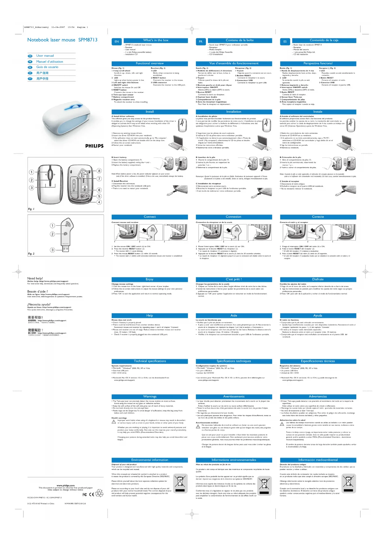 Vue d’ensemble du fonctionnement Souris (Fig. 1)1 Mollette de défilement à 4 directionsPermet de défiler vers le haut, le bas, lagauche et la droite.2 VoyantS’allume quand le niveau de la pile estfaible.3 Boutons gauche et droit pour cliquer4 Interrupteur ON/OFFAllume (ON) ou éteint (OFF) la souris.5 Bouton RESETConnecte la souris au récepteur.6 Capteur laser double7 Compartiment de la pile8 Zone du récepteur magnétiquePour fixer le récepteur en déplacement.Récepteur (Fig. 2)1 VoyantClignote quand la connexion est en cours.2 Bouton RESETConnecte le récepteur à la souris.3 Connecteur USBConnecte le récepteur au port USB. C'est prêt ! Changer les paramètres de la souris 1 Cliquez sur l’icône de la souris, dans l’angle inférieur droit de votre barre des tâches. 2 Suivez les instructions à l’écran pour ajuster les paramètres de la souris selon vospréférences personnelles.3 Appuyez sur ‘OK’ pour quitter l’application et retourner en mode de fonctionnementnormal. Aide La souris ne fonctionne pas• Vérifiez que la pile est placée correctement. • Il peut y avoir une interférence provenant d’un autre périphérique sans fil. Reconnectez la souris et le récepteur en répétant les étapes 1 et 2 de la section « Connexion ». • La souris et le récepteur sont hors de portée l’un de l’autre. Réduisez la distance entre la souris et le récepteur (max. 10 mètres / 30 pieds). • Vérifiez si le récepteur est correctement branché au port USB de l’ordinateur portable. Configuration requise du système• Microsoft ® Windows ® 2000, Me, XP ou Vista• Un port USB libre• Lecteur de CD/DVD• Les versions pour Macintosh Mac OS X 10.1.x-10.4.x peuvent être téléchargées surwww.philips.com/support. Connexion Connexion du récepteur et de la souris 123