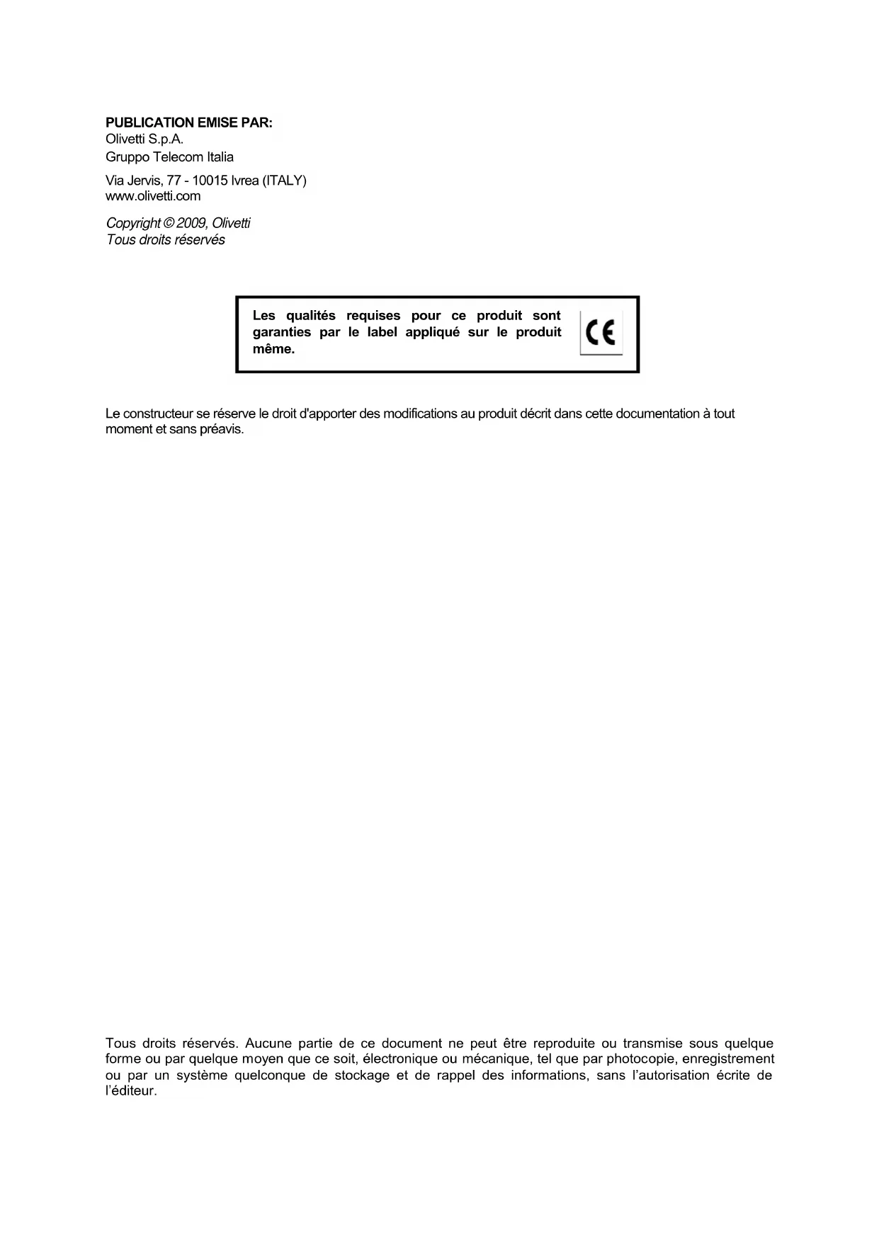 Loi applicable Etant donné l'évolution permanente de la technologie, le fabricant se réserve le droit de modifier les caractéristiques techniques indiquées pour ce produit, à tout moment, sans avis préalable, et/ou d'interrompre la production de ce produit. Tous les noms de produits et de marques pouvant être des marques déposées par leurs détenteurs respectifs sont reconnues dans les présentes. Marques déposées En raison de l’évolution technique, Olivetti se réserve le droit à tout moment et sans préavis, de modifier les caractéristiques techniques annoncées pour ce produit et/ou de cesser la fabrication de celui-ci. Companion Suite Pro est une marque déposée de Olivetti. Adobe® et les produits Adobe® cités sont des marques déposées d’Adobe Systems Incorporated. PaperPort11SE est une marque déposée de ScanSoft. Microsoft® Windows® 98, Microsoft® Windows® Millennium, Microsoft® Windows NT®, Microsoft® Windows 2000®, Microsoft® Windows XP®, Microsoft® Windows Vista® et tout autre produit Microsoft® cité sont des marques de Microsoft Corporation déposées et/ou utilisées aux États-Unis et/ou dans d’autres pays. Toutes les autres marques ou noms de produits cités à titre d’exemple ou d’information sont des marques déposées de leurs détenteurs respectifs. Les informations contenues dans ce livret d’utilisation sont sujettes à modification sans préavis. Reproductions interdites Ne copiez jamais ou n’imprimez jamais des documents dont la reproduction est interdite par la loi. L’impression et la copie des documents suivants sont généralement interdites par la loi :