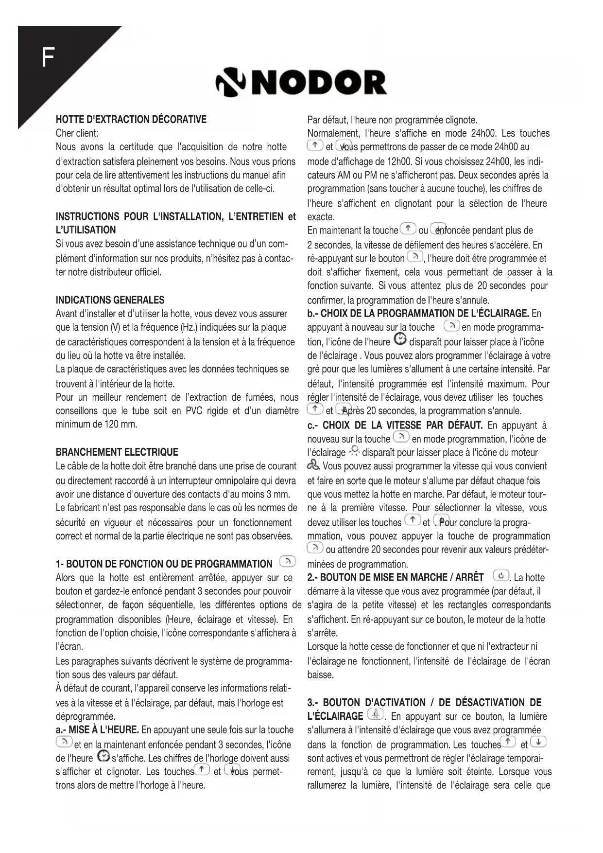 1- BOUTON DE FONCTION OU DE PROGRAMMATION Alors que la hotte est entièrement arrêtée, appuyer sur ce