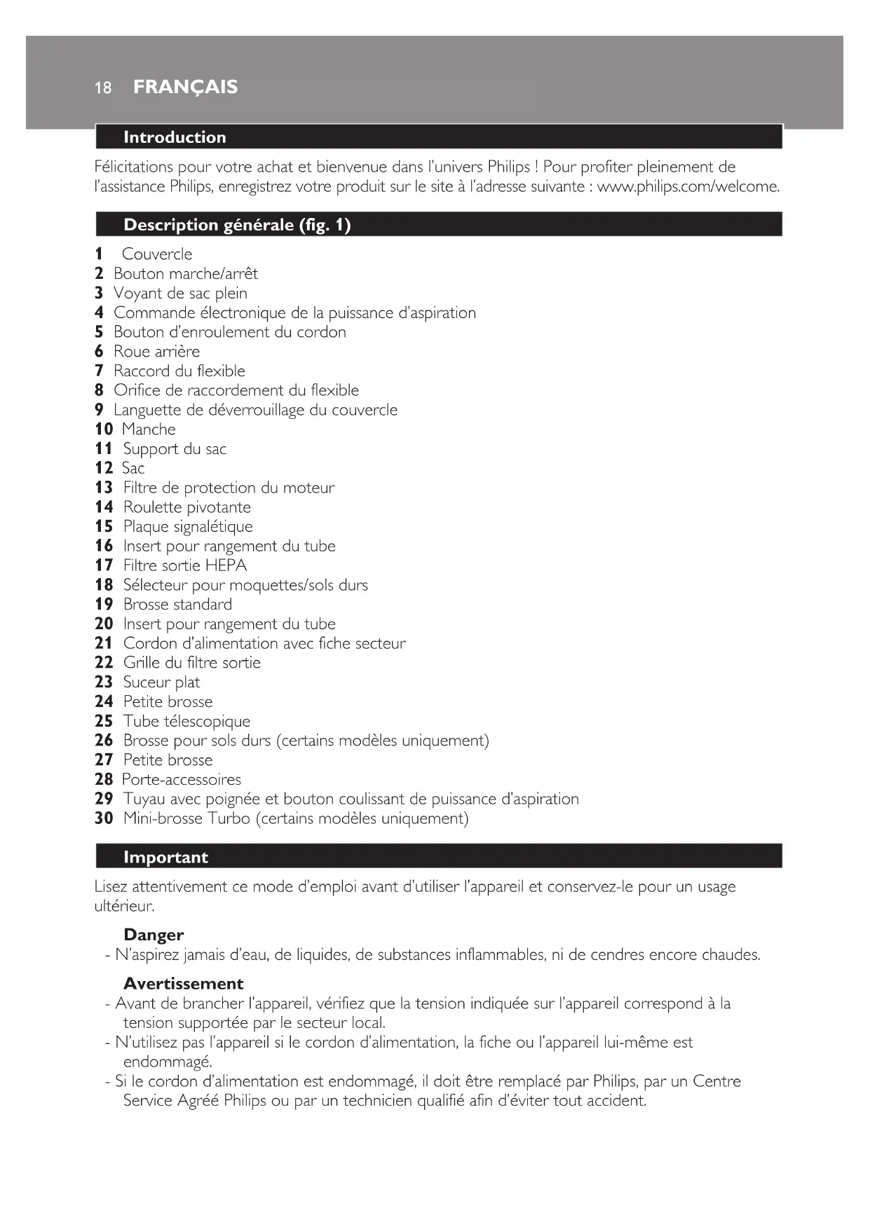 - Si le cordon d’alimentation est endommagé, il doit être remplacé par Philips, par un Centre