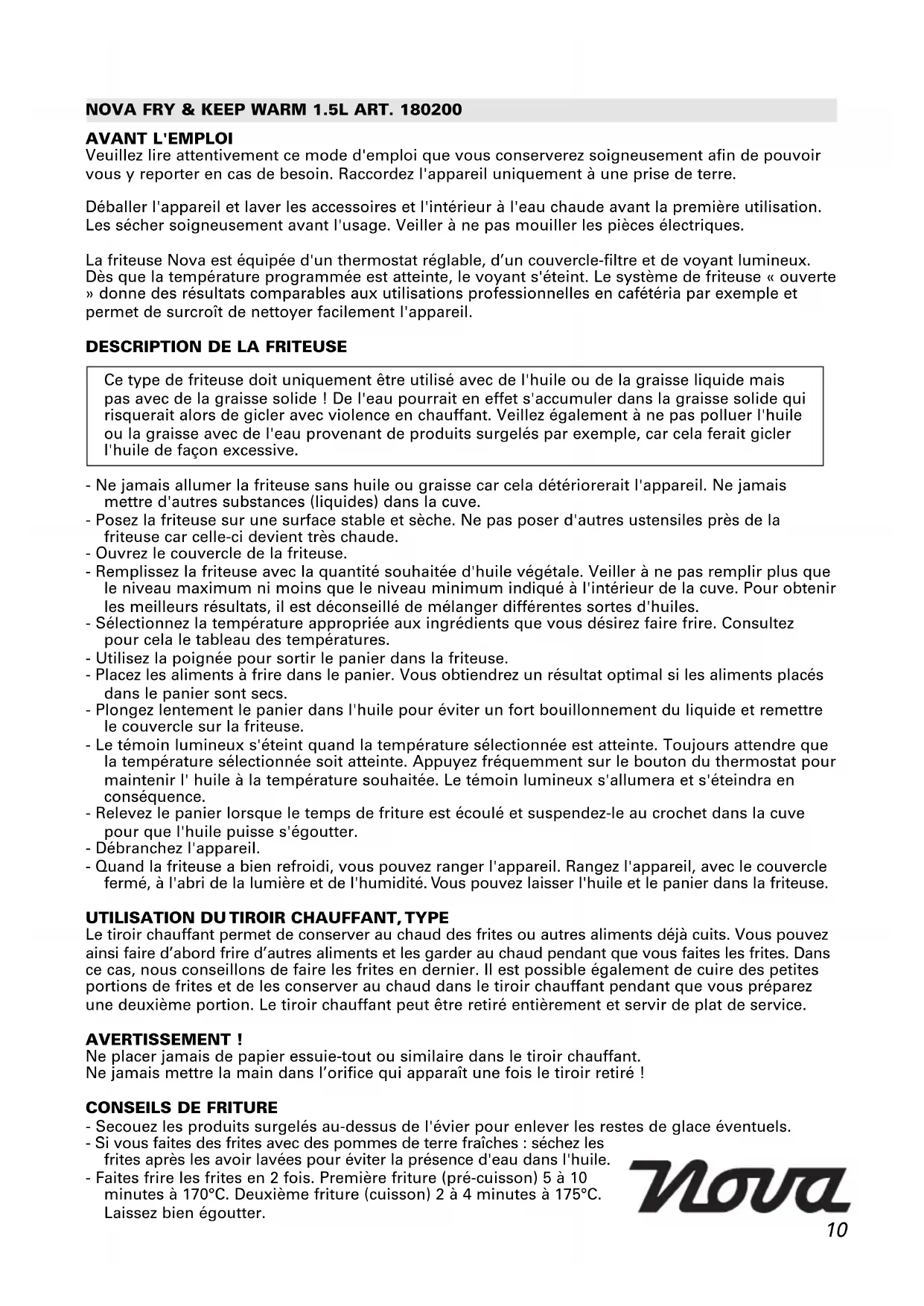 AVANT L'EMPLOI Veuillez lire attentivement ce mode d'emploi que vous conserverez soigneusement afin de pouvoir vous y reporter en cas de besoin. Raccordez l'appareil uniquement à une prise de terre. Déballer l'appareil et laver les accessoires et l'intérieur à l'eau chaude avant la première utilisation. Les sécher soigneusement avant l'usage. Veiller à ne pas mouiller les pièces électriques. La friteuse Nova est équipée d'un thermostat réglable, d’un couvercle-filtre et de voyant lumineux. Dès que la température programmée est atteinte, le voyant s'éteint. Le système de friteuse « ouverte » donne des résultats comparables aux utilisations professionnelles en cafétéria par exemple et permet de surcroît de nettoyer facilement l'appareil.