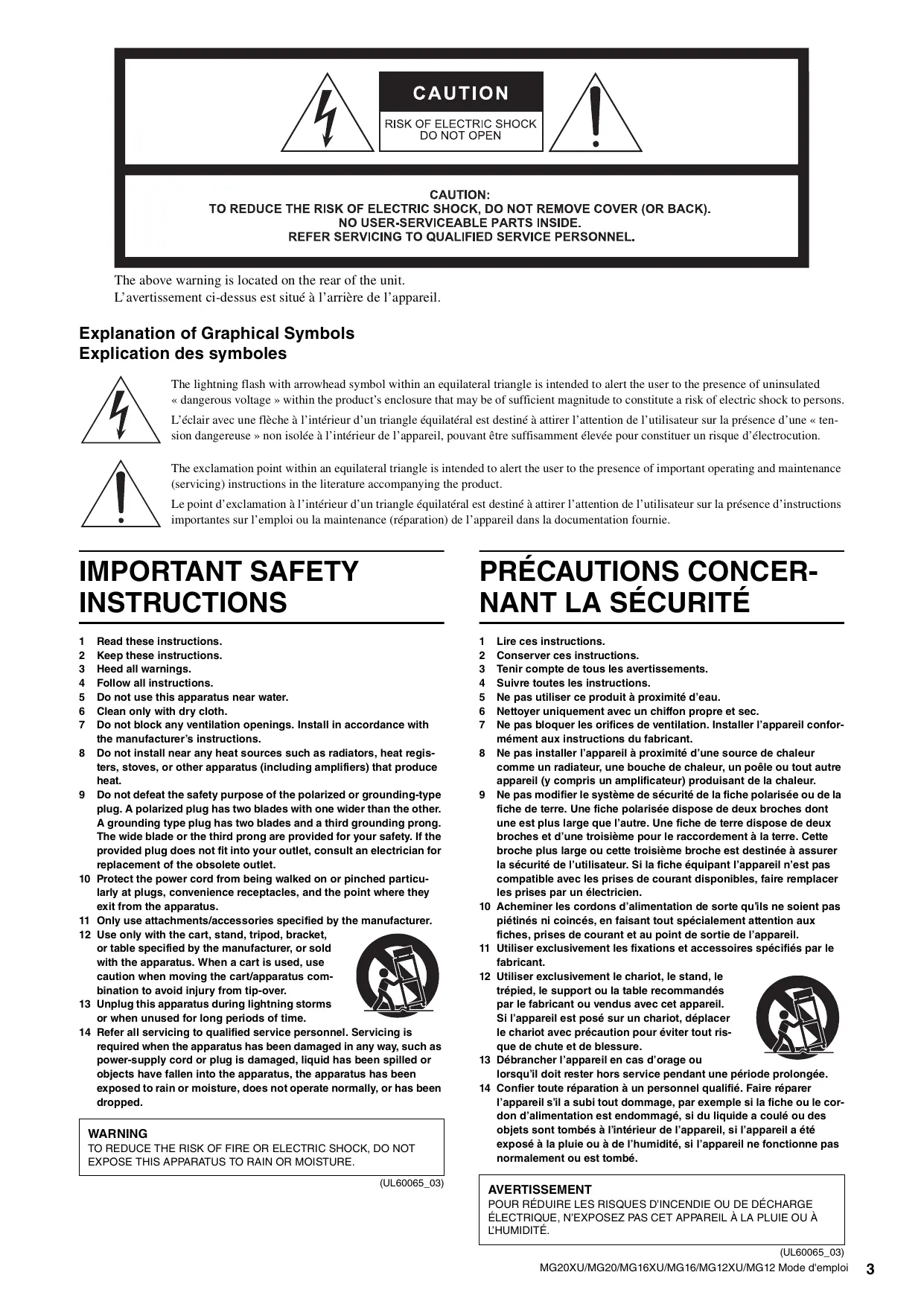 Lire ces instructions. Conserver ces instructions. Tenir compte de tous les avertissements. Suivre toutes les instructions. Ne pas utiliser ce produit à proximité d’eau. Nettoyer uniquement avec un chiffon propre et sec. Ne pas bloquer les orifices de ventilation. Installer l’appareil conformément aux instructions du fabricant. Ne pas installer l’appareil à proximité d’une source de chaleur comme un radiateur, une bouche de chaleur, un poêle ou tout autre appareil (y compris un amplificateur) produisant de la chaleur. Ne pas modifier le système de sécurité de la fiche polarisée ou de la fiche de terre. Une fiche polarisée dispose de deux broches dont une est plus large que l’autre. Une fiche de terre dispose de deux broches et d’une troisième pour le raccordement à la terre. Cette broche plus large ou cette troisième broche est destinée à assurer la sécurité de l’utilisateur. Si la fiche équipant l’appareil n’est pas compatible avec les prises de courant disponibles, faire remplacer les prises par un électricien. Acheminer les cordons d’alimentation de sorte qu’ils ne soient pas piétinés ni coincés, en faisant tout spécialement attention aux fiches, prises de courant et au point de sortie de l’appareil. Utiliser exclusivement les fixations et accessoires spécifiés par le fabricant. Utiliser exclusivement le chariot, le stand, le trépied, le support ou la table recommandés par le fabricant ou vendus avec cet appareil. Si l’appareil est posé sur un chariot, déplacer le chariot avec précaution pour éviter tout risque de chute et de blessure. Débrancher l’appareil en cas d’orage ou lorsqu’il doit rester hors service pendant une période prolongée. Confier toute réparation à un personnel qualifié. Faire réparer l’appareil s’il a subi tout dommage, par exemple si la fiche ou le cordon d’alimentation est endommagé, si du liquide a coulé ou des objets sont tombés à l’intérieur de l’appareil, si l’appareil a été exposé à la pluie ou à de l’humidité, si l’appareil ne fonctionne pas normalement ou est tombé. AVERTISSEMENT POUR RÉDUIRE LES RISQUES D’INCENDIE OU DE DÉCHARGE ÉLECTRIQUE, N’EXPOSEZ PAS CET APPAREIL À LA PLUIE OU À L’HUMIDITÉ. (UL60065_03) MG20XU/MG20/MG16XU/MG16/MG12XU/MG12 Mode d'emploi