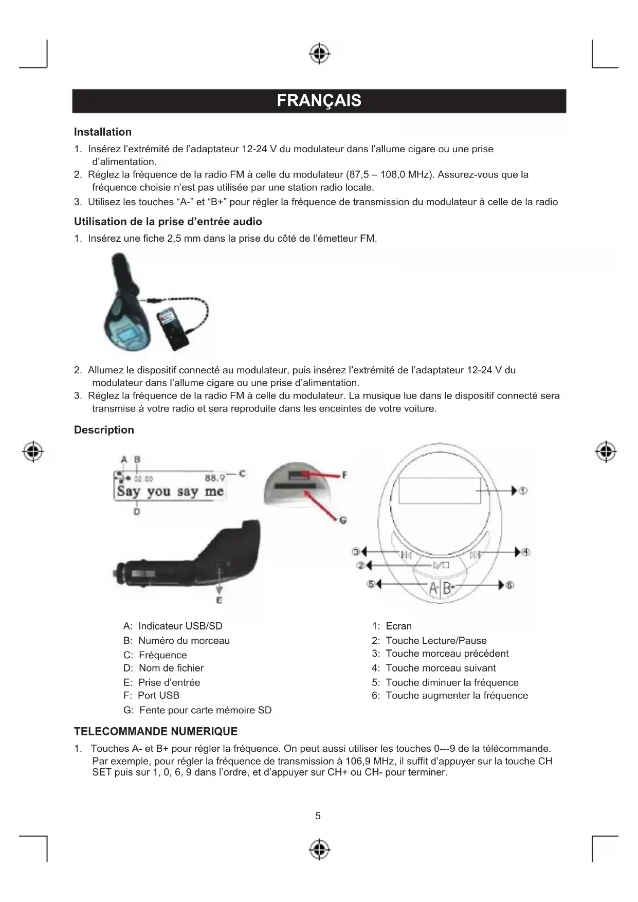 - Utilisez les touches "A- " et "B+ " pour regler la fréquence de transmission du modulator à celle de la radio