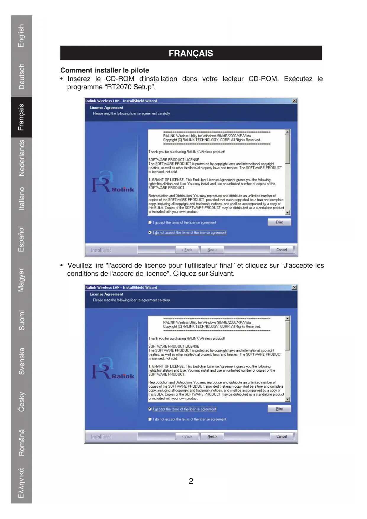 - Insérez le CD-ROM d'installation dans votre lecteur CD-ROM. Execuéz le programme "RT2070 Setup".