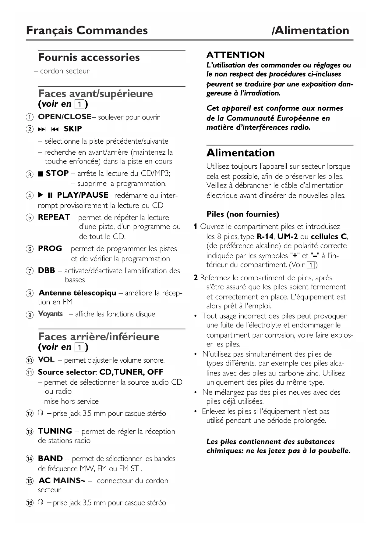 BAND – permet de sélectionner les bandes de fréquence MW, FM ou FM ST . % AC MAINS~ – connecteur du cordon secteur ^ p – prise jack 3,5 mm pour casque stéréo ATTENTION L’utilisation des commandes ou réglages ou le non respect des procédures ci-incluses peuvent se traduire par une exposition dan- gereuse à l’irradiation. Cet appareil est conforme aux normes de la Communauté Européenne en matière d’interférences radio. Alimentation Utilisez toujours l’appareil sur secteur lorsque cela est possible, afin de préserver les piles. Veillez à débrancher le câble d’alimentation électrique avant d’insérer de nouvelles piles. Piles (non fournies) 1 Ouvrez le compartiment piles et introduisez les 8 piles, type R-14, UM-2 ou cellules C, (de préférence alcaline) de polarité correcte indiquée par les symboles "+" et "–" à l'in- térieur du compartiment. (Voir 1) 2 Refermez le compartiment de piles, après s'être assuré que les piles soient fermement et correctement en place. L'équipement est alors prêt à l'emploi.