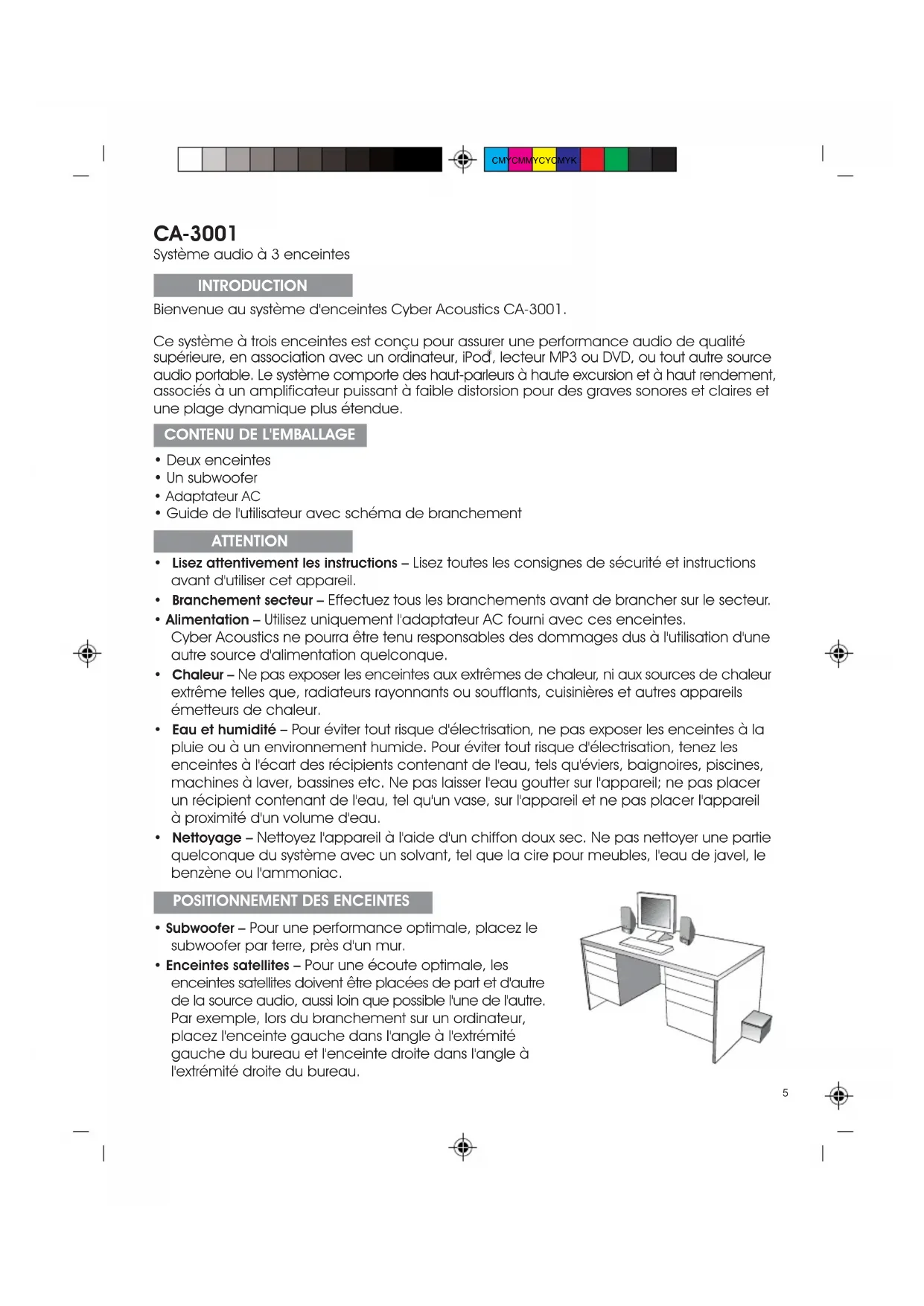 , lecteur MP3 ou DVD, ou tout autre source audio portable. Le système comporte des haut-parleurs à haute excursion et à haut rendement, associés à un amplificateur puissant à faible distorsion pour des graves sonores et claires et une plage dynamique plus étendue. Deux enceintes Un subwoofer Adaptateur AC Guide de l'utilisateur avec schéma de branchement Lisez attentivement les instructions Lisez toutes les consignes de sécurité et instructions avant d'utiliser cet appareil. Branchement secteur Effectuez tous les branchements avant de brancher sur le secteur. Alimentation Utilisez uniquement l'adaptateur AC fourni avec ces enceintes. Cyber Acoustics ne pourra être tenu responsables des dommages dus à l'utilisation d'une autre source d'alimentation quelconque. Chaleur Ne pas exposer les enceintes aux extrêmes de chaleur, ni aux sources de chaleur extrême telles que, radiateurs rayonnants ou soufflants, cuisinières et autres appareils émetteurs de chaleur. Eau et humidité Pour éviter tout risque d'électrisation, ne pas exposer les enceintes à la pluie ou à un environnement humide. Pour éviter tout risque d'électrisation, tenez les enceintes à l'écart des récipients contenant de l'eau, tels qu'éviers, baignoires, piscines, machines à laver, bassines etc. Ne pas laisser l'eau goutter sur l'appareil; ne pas placer un récipient contenant de l'eau, tel qu'un vase, sur l'appareil et ne pas placer l'appareil à proximité d'un volume d'eau. Nettoyage Nettoyez l'appareil à l'aide d'un chiffon doux sec. Ne pas nettoyer une partie quelconque du système avec un solvant, tel que la cire pour meubles, l'eau de javel, le benzène ou l'ammoniac. Subwoofer Pour une performance optimale, placez le subwoofer par terre, près d'un mur. Enceintes satellites Pour une écoute optimale, les enceintes satellites doivent être placées de part et d'autre de la source audio, aussi loin que possible l'une de l'autre. Par exemple, lors du branchement sur un ordinateur, placez l'enceinte gauche dans l'angle à l'extrémité gauche du bureau et l'enceinte droite dans l'angle à l'extrémité droite du bureau. 5C M Y CM MY CY CMY K