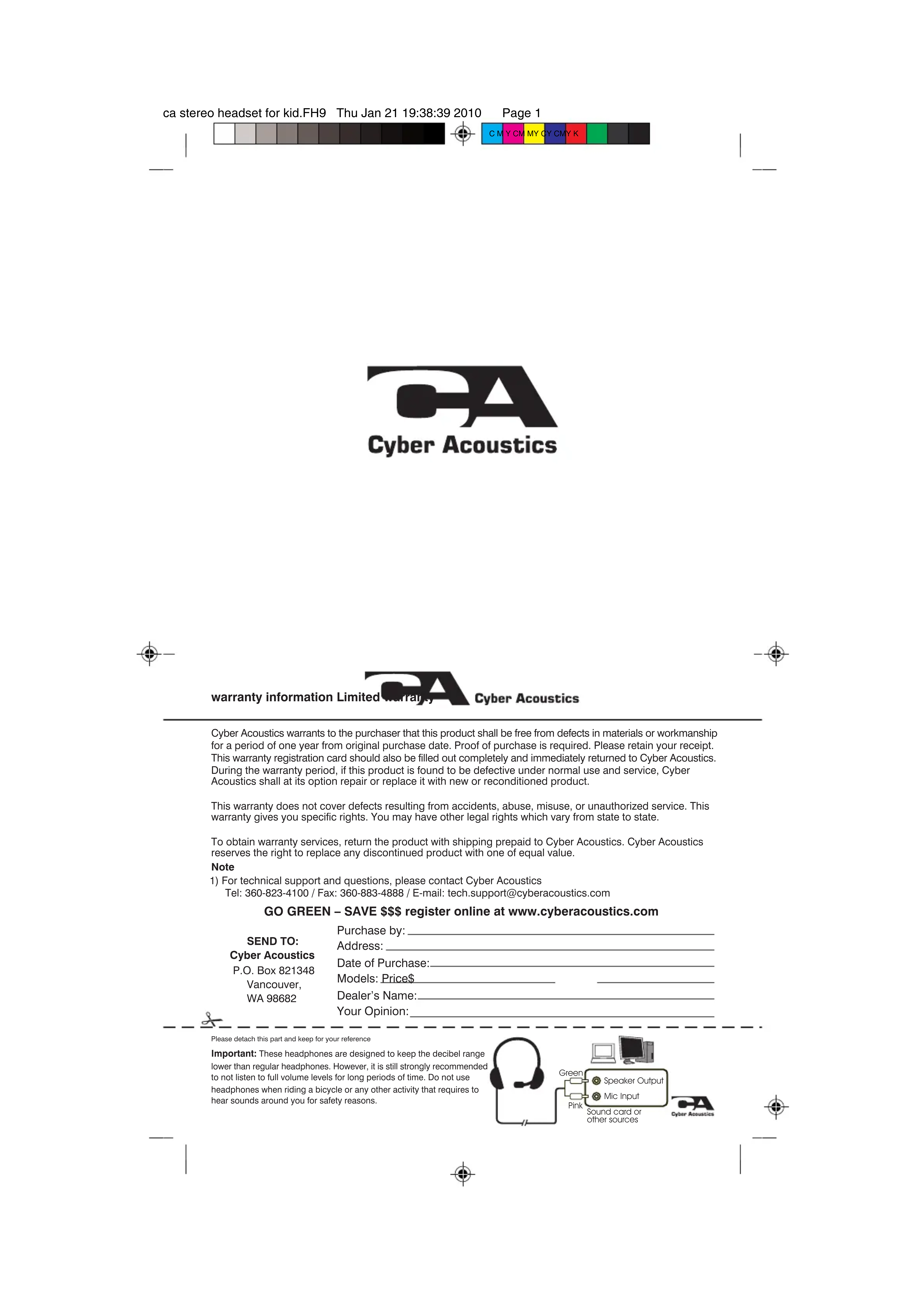 Tel: 360-823-4100 / Fax: 360-883-4888 / E-mail: tech.support@cyberacoustics.com Note GO GREEN SAVE $$$ register online at www.cyberacoustics.com Purchase by: Address: Date of Purchase: Models: Price$ Dealers Name: Your Opinion: Speaker OutputSound card orother sourcesMic InputGreen Pinkca stereo headset for kid.FH9 Thu Jan 21 19:38:39 2010 Page 2 C M Y CM MY CY CMY K Cyber Acoustics garantit ce produit contre tout défaut de matière et de fabrication, et ce pendant une période d'un an à compter de la date d'achat originelle. Un justificatif d'achat sera demandé ; veuillez conserver votre ticket de caisse. Cette fiche de garantie devra être remplie et renvoyée immédiatement à Cyber Acoustics. Si, pendant la période de garantie, ce produit s'avère défectueux en conditions d'utilisation normales, Cyber Acoustics le réparera ou, à son appréciation, le remplacera par un produit neuf ou reconditionné. Cette garantie ne s'applique pas aux défauts résultant d'accidents, d'un abus ou d'une utilisation non conforme ou d'une intervention non autorisée. Cette garantie vos confère des droits spécifiques. Vous possédez peut-être d'autres droits qui, eux, varient selon les états. Pour toute intervention sous garantie, retournez le produit à Cyber Acoustics en port payé. Cyber Acoustics se réserve le droit de remplacer tout produit en fin de série par un produit d'une valeur égale. Remarque : informations sur la garantie Garantie limitée Veuillez détacher cette partie et la conserver pour information Nom de l'acheteur : Adresse : Date d'achat : Modèle : Prix $ Nom du revendeur : Votre opinion : ENVOYER A : Cyber Acoustics P.O. Box 821348 Vancouver, WA 98682 Important: ces écouteurs sont conçus pour garder le rayon desdecibels au-dessous de celui des écouteurs normaux. Cependant,il est fortement recommandé de ne pas écouter à plein volumependant une période prolongée. Ne pas utiliser les écouteurs pourfaire du vélo ou toute activité demandant qu'on entende les bruitsenvironnants par mesure de sécurité. Soyez écolo - Faites des économies en vous enregistrant en ligne à www.cyberacoustics.com