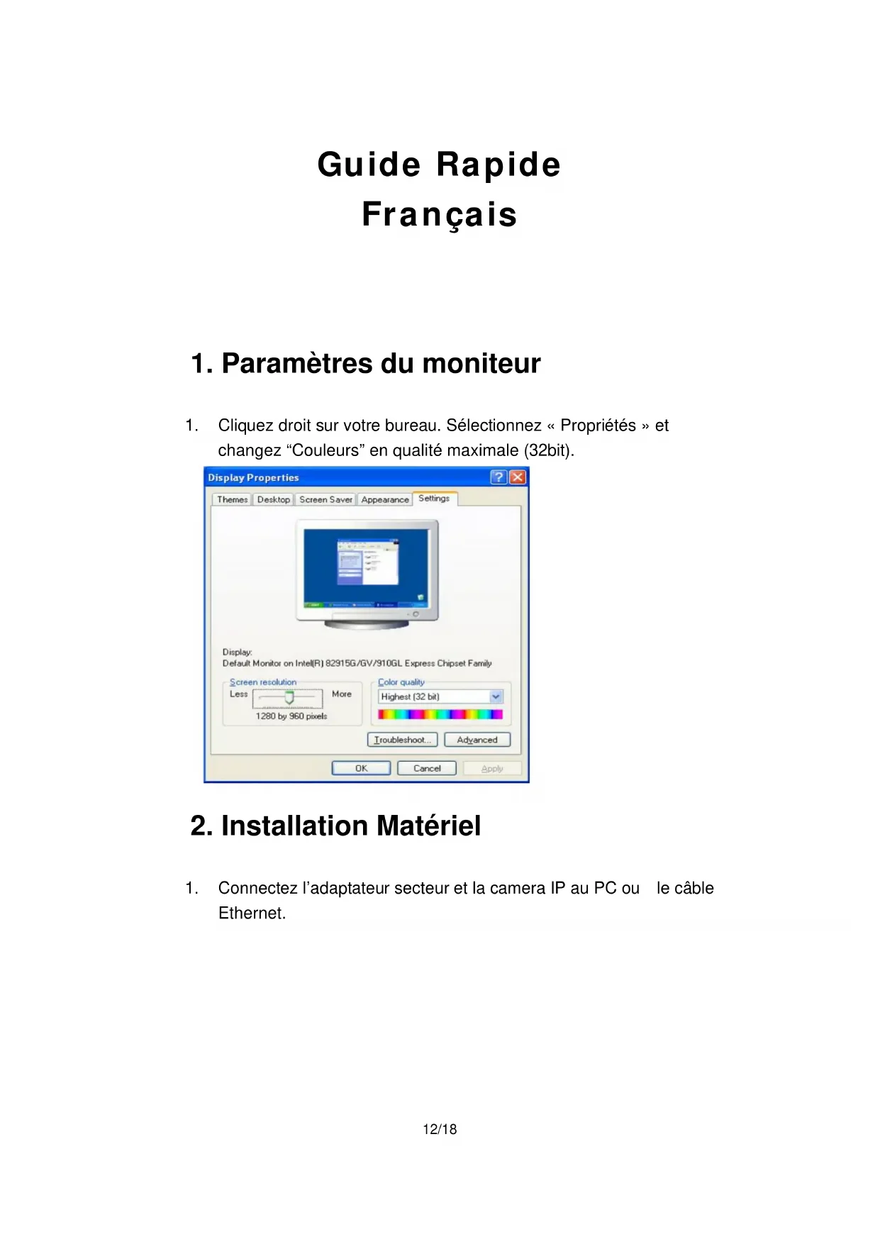 - Cliquez droit sur votre bureau. Sélectionnez « Propriétés » et changez “Couleurs” en qualité maximale (32bit).