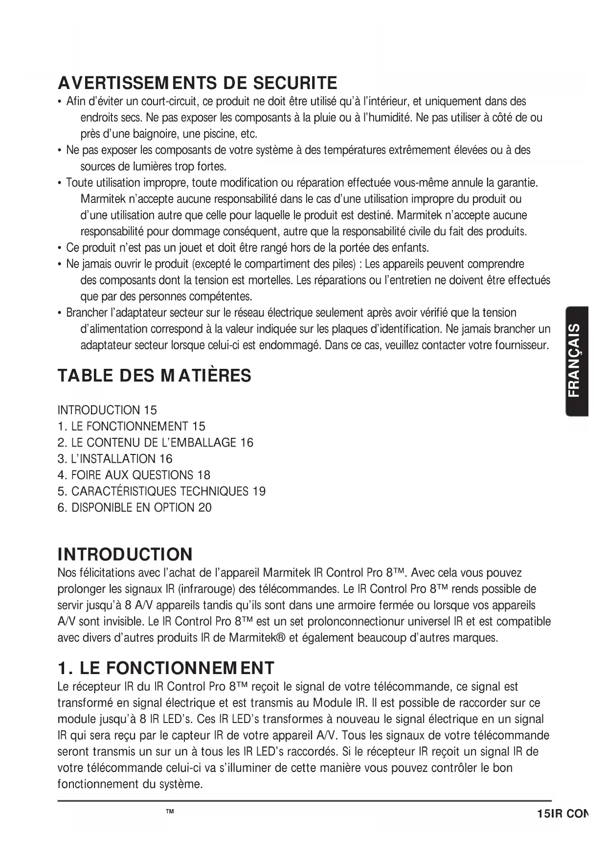 INTRODUCTION Nos félicitations avec l’achat de l’appareil Marmitek IR Control Pro 8™. Avec cela vous pouvez prolonger les signaux IR (infrarouge) des télécommandes. Le IR Control Pro 8™ rends possible de servir jusqu’à 8 A/V appareils tandis qu’ils sont dans une armoire fermée ou lorsque vos appareils A/V sont invisible. Le IR Control Pro 8™ est un set prolonconnectionur universel IR et est compatible avec divers d’autres produits IR de Marmitek® et également beaucoup d’autres marques.