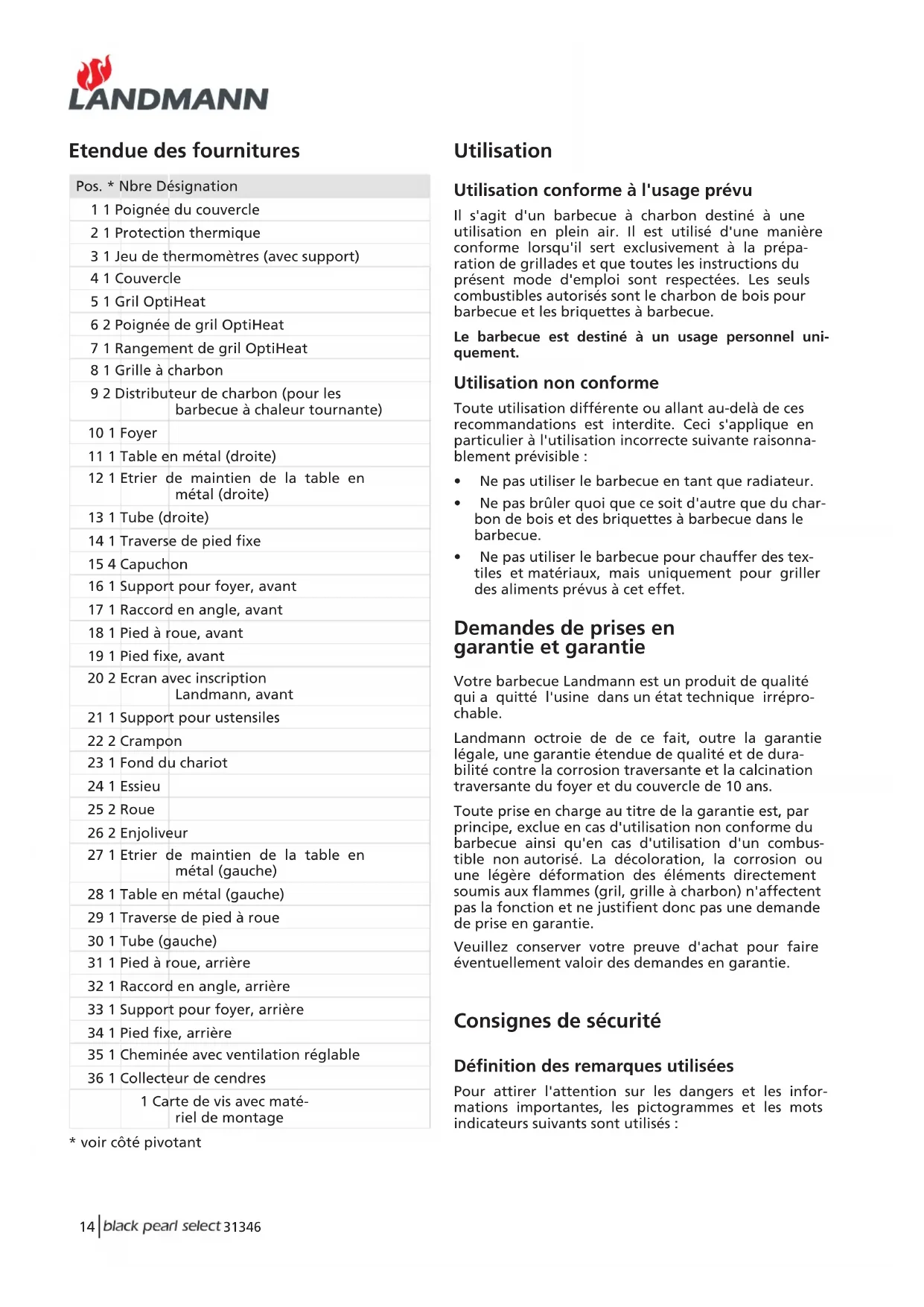 - voir côté pivotant Demandes de prises en garantie et garantie Votre barbecue Landmann est un produit de qualité qui a quitté l'usine dans un état technique irrépro- chable. Landmann octroie de de ce fait, outre la garantie légale, une garantie étendue de qualité et de dura- bilité contre la corrosion traversante et la calcination traversante du foyer et du couvercle de 10 ans. Toute prise en charge au titre de la garantie est, par principe, exclue en cas d'utilisation non conforme du barbecue ainsi qu'en cas d'utilisation d'un combus- tible non autorisé. La décoloration, la corrosion ou une légère déformation des éléments directement soumis aux flammes (gril, grille à charbon) n'affectent pas la fonction et ne justifient donc pas une demande de prise en garantie. Veuillez conserver votre preuve d'achat pour faire éventuellement valoir des demandes en garantie. Consignes de sécurité Définition des remarques utilisées Pour attirer l'attention sur les dangers et les infor- mations importantes, les pictogrammes et les mots indicateurs suivants sont utilisés :31346