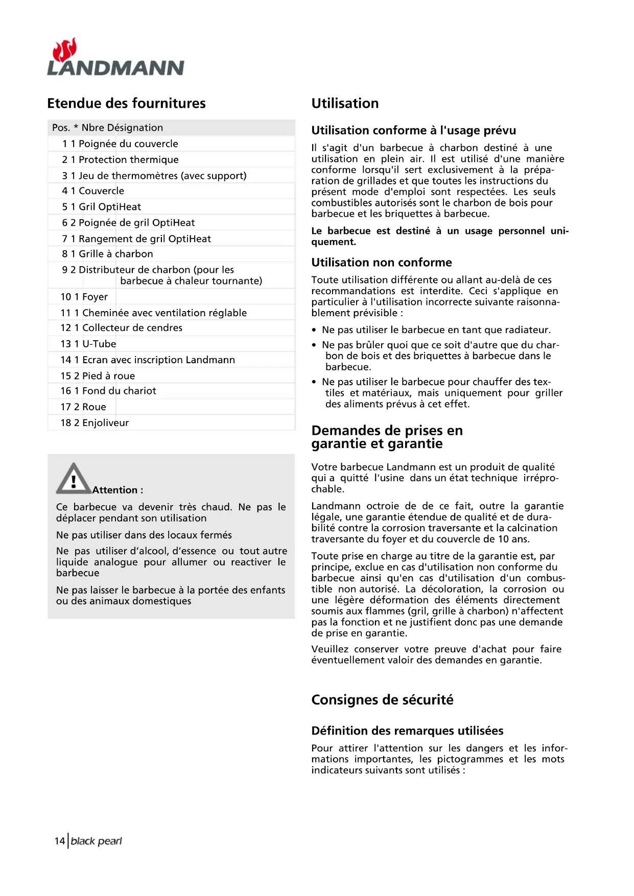 - Ne pas utiliser le barbecue pour chauffer des tex- tiles et matériaux, mais uniquement pour griller des aliments prévus à cet effet. Etendue des fournitures Pos. * Nbre Désignation 1 1 Poignée du couvercle 2 1 Protection thermique 3 1 Jeu de thermomètres (avec support) 4 1 Couvercle 5 1 Gril OptiHeat 6 2 Poignée de gril OptiHeat 7 1 Rangement de gril OptiHeat 8 1 Grille à charbon 9 2 Distributeur de charbon (pour les barbecue à chaleur tournante) 10 1 Foyer 11 1 Cheminée avec ventilation réglable 12 1 Collecteur de cendres 13 1 U-Tube 14 1 Ecran avec inscription Landmann 15 2 Pied à roue 16 1 Fond du chariot 17 2 Roue 18 2 Enjoliveur Demandes de prises en garantie et garantie Votre barbecue Landmann est un produit de qualité qui a quitté l'usine dans un état technique irrépro- chable. Landmann octroie de de ce fait, outre la garantie légale, une garantie étendue de qualité et de dura- bilité contre la corrosion traversante et la calcination traversante du foyer et du couvercle de 10 ans. Toute prise en charge au titre de la garantie est, par principe, exclue en cas d'utilisation non conforme du barbecue ainsi qu'en cas d'utilisation d'un combus- tible non autorisé. La décoloration, la corrosion ou une légère déformation des éléments directement soumis aux flammes (gril, grille à charbon) n'affectent pas la fonction et ne justifient donc pas une demande de prise en garantie. Veuillez conserver votre preuve d'achat pour faire éventuellement valoir des demandes en garantie. Consignes de sécurité Définition des remarques utilisées Pour attirer l'attention sur les dangers et les infor- mations importantes, les pictogrammes et les mots indicateurs suivants sont utilisés : Attention : Ce barbecue va devenir très chaud. Ne pas le déplacer pendant son utilisation Ne pas utiliser dans des locaux fermés Ne pas utiliser d’alcool, d’essence ou tout autre liquide analogue pour allumer ou reactiver le barbecue Ne pas laisser le barbecue à la portée des enfants ou des animaux domestiques15 Dangers résiduels