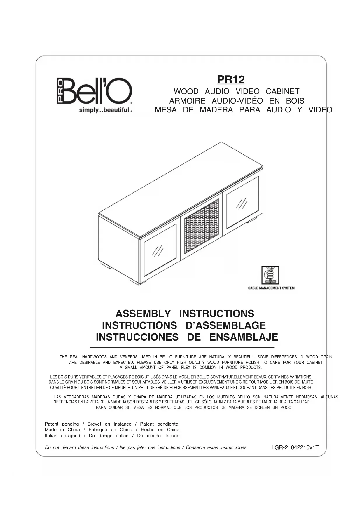 Bell'O International Corp décline toute responsabilité en cas d'assemblage non conforme aux instructions ou pour l'assemblage, l'utilisation ou la manutention incorrects de ce meuble.