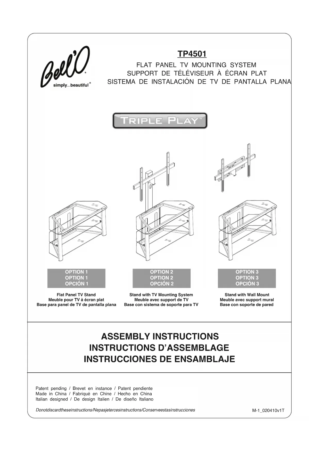 Téléchargez la notice de votre Support écran plat au format PDF gratuitement ! Retrouvez votre notice TP4501 - Bell'O et reprennez votre appareil électronique en main. Sur cette page sont publiés tous les documents nécessaires à l'utilisation de votre appareil TP4501 de la marque Bell'O.