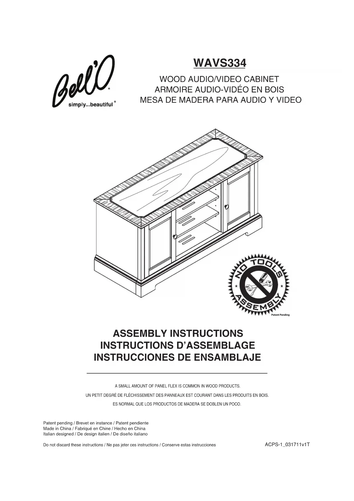 Bell'O International Corps décline toute responsabilité en cas d'assemblage non conforme aux instructions ou pour l'assemblage, l'utilisation ou la manutention incorrents de ce meuble.