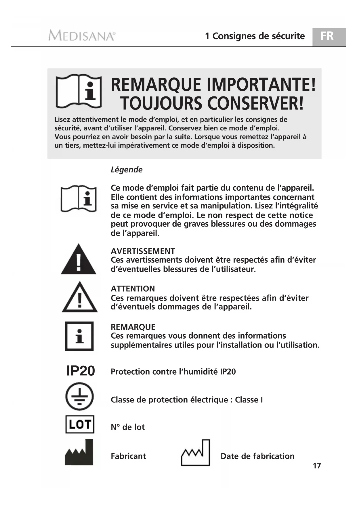 AVERTISSEMENT Ces averissements doivent être respectés afin d'éviter d'eventuelles blessures de l'utilisateur.